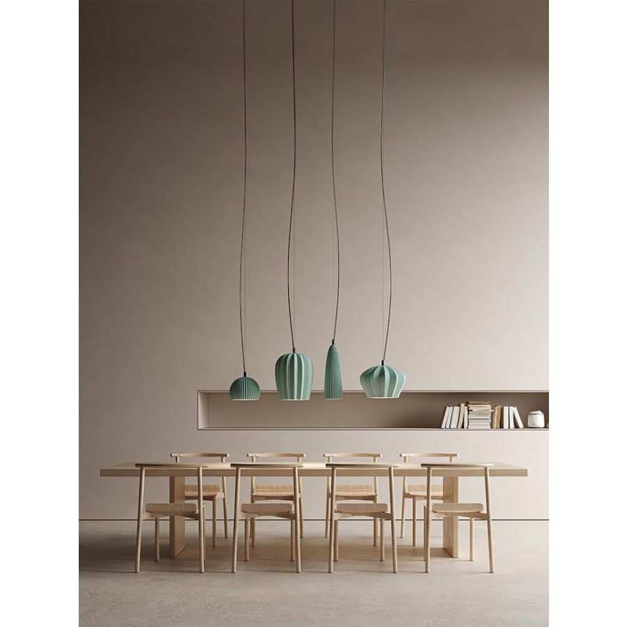 The suspension has a bright white or emerald green ceramic lampshade that is inspired by the shapes of the large desert cactus. Each piece of the green version has a different hue due to a particular oxidation process. It comes in four different shapes and sizes, and can also be put together in clusters.