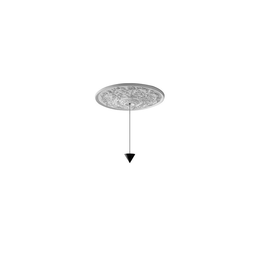 A thin black cable hangs from a large baroque rose window with a floral motif in white plaster, connected to one or two black luminum cones at the end of the cable. The combination of this element and the clasical motif of the ceiling cup makes Moonbloom a discreet architectural suspension. The rose window, available in two sizes, can be painted, immediately changing its expressiveness with a simple gesture.