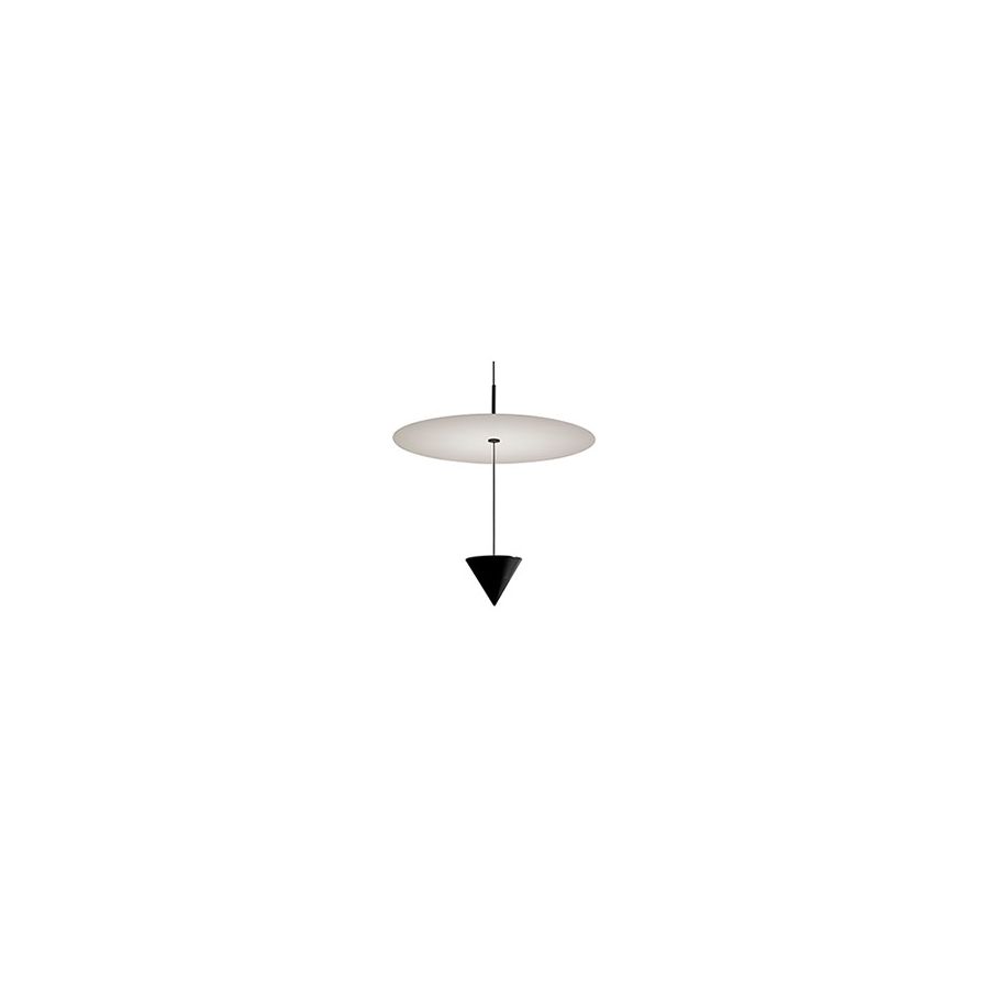 The lamp consists of a suspended circle reminescent of a full moon, two flat white aluminium discs of different diameters, where the circle of light from the inverted cone of black aluminium is perfectly reflected. The weights and anti-wheights are balanced between the geometric body of the lamp, to provide an elegant soft light from this ultra-minimal aesthetic suspension.