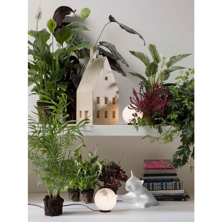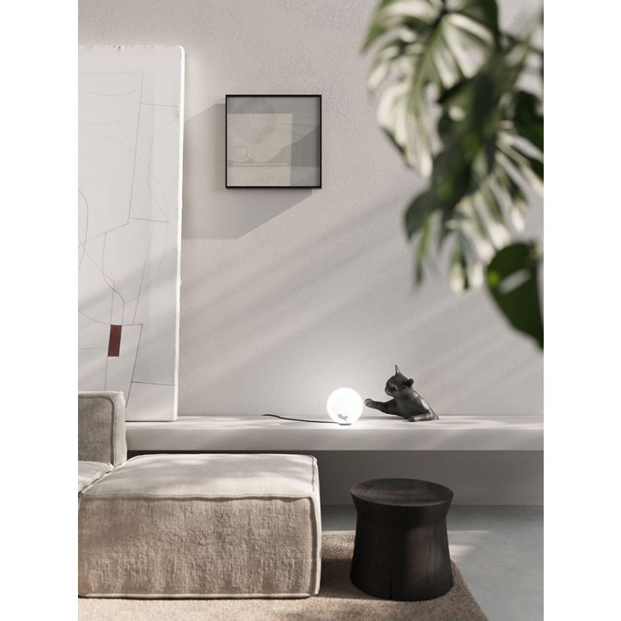 The cat appears to jump out of the wall or from the table, and playfully tease the mouse with its paws inside the luminous sphere. Composed of two elements, a cat body made of matt white ceramic and charcoal black ceramic a glass sphere with mouse-shaped inner sticker, MAOO can be hung on a wall or placed on a desk, bedside table, or table top. MAOO joins Karman Zoo, the famous collection of ceramic lamps designed by Matteo Ugolini and inspired by the animal world.
