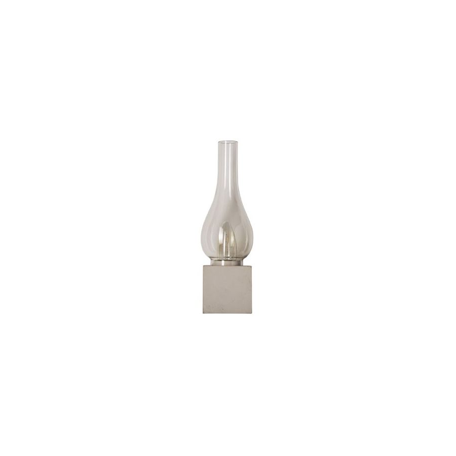 The classic oil lamp has been redesigned with lines that match the contemporary environment. This piece recalls a memory of ancient forms in which different materials are mixed together: the raw concrete or white cubic base is fitted with a diffuser of clear, smoked or satin glass. Their reflections remind us of a flame moved by the wind. Table and wall lamps versions are available.