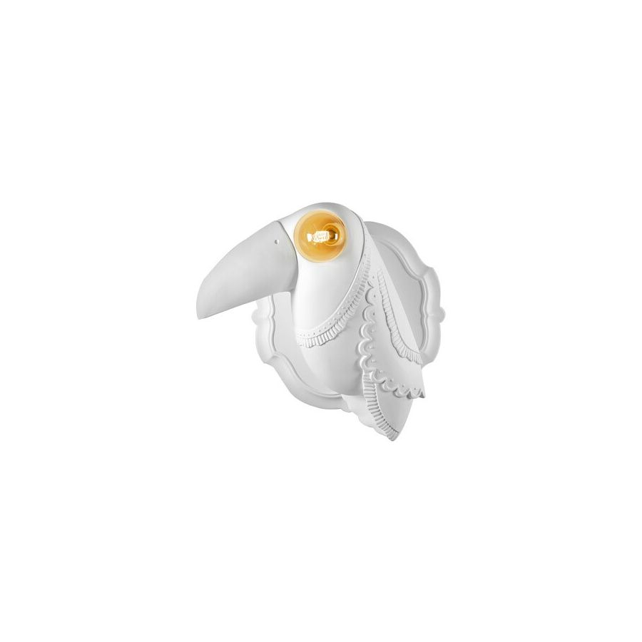Toucan-shaped applique with huge and characteristic beak keeps an eye on us while switched on, and it is like a real piece of furniture while turned of. Made of white ceramic and has patterns of plumage that look like French lace and pastry.