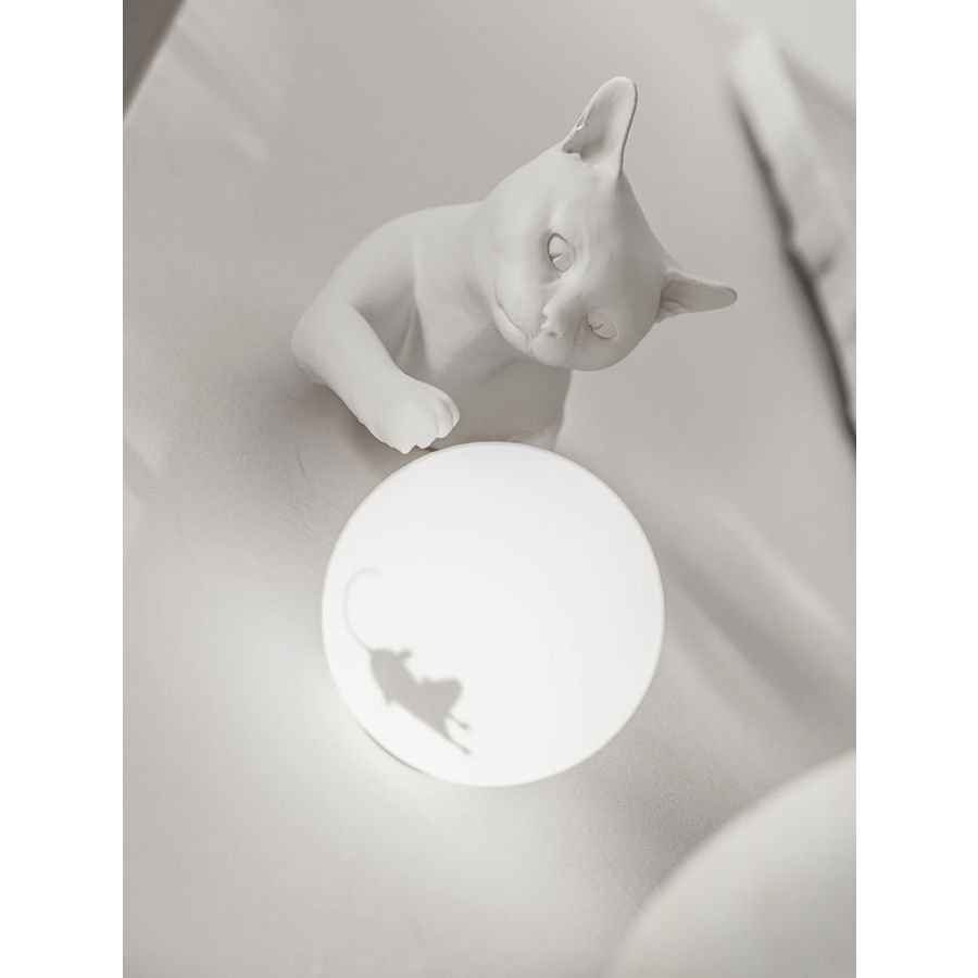 The cat appears to jump out of the wall or from the table, and playfully tease the mouse with its paws inside the luminous sphere. Composed of two elements, a cat body made of matt white ceramic and charcoal black ceramic a glass sphere with mouse-shaped inner sticker, MAOO can be hung on a wall or placed on a desk, bedside table, or table top. MAOO joins Karman Zoo, the famous collection of ceramic lamps designed by Matteo Ugolini and inspired by the animal world.