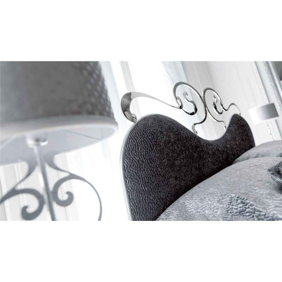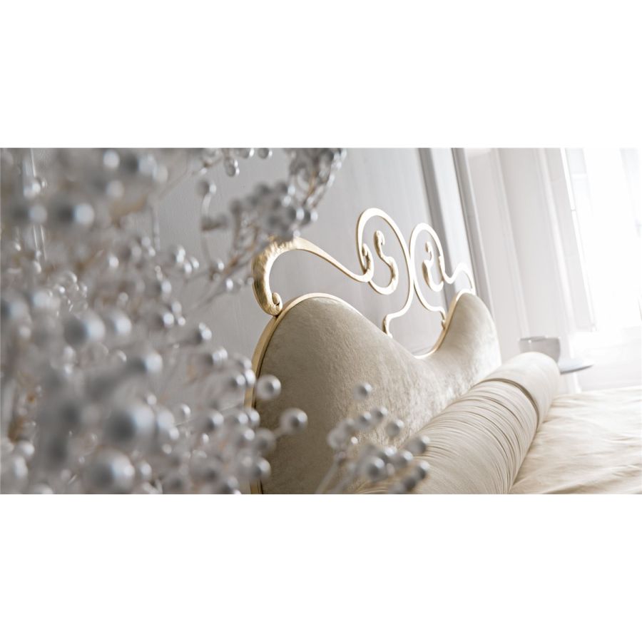 A neo-classic bed with a soft heart-shaped bedhead, enriched by the refined forged laser cutted iron detail. A bed with perfect symmetry, enchanting with its different and new possibility of decoration and combination with fabrics or leathers for the upholsteries of bedhead and bedrail.