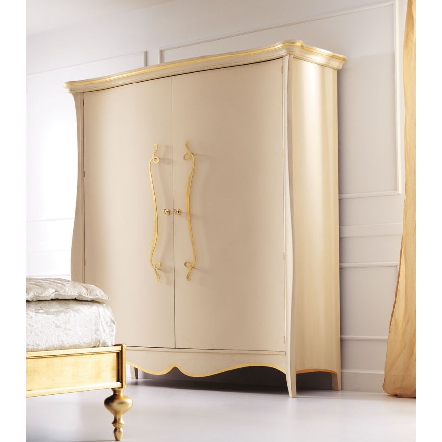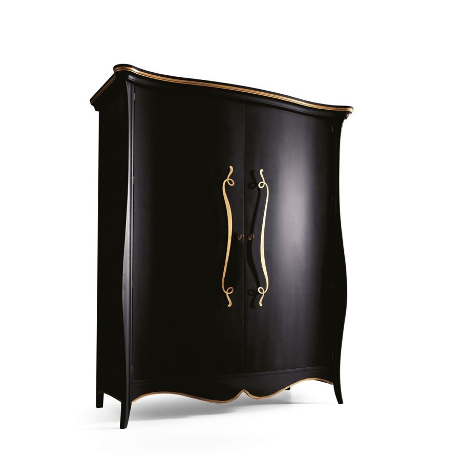 An elegant, classic wardrobe with shaped sides and slightly waved doors. This fresh and original version of the classic wardrobe is supplied with long laser cutted iron handles. The contrasting finishings and the wide palette of colours makes this wardrobe suitable for bedrooms, dining romm and hallway. Together with the dresser and bedside tables of the same line, they create a romantic and refined night environment.