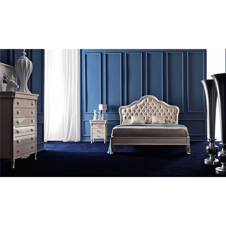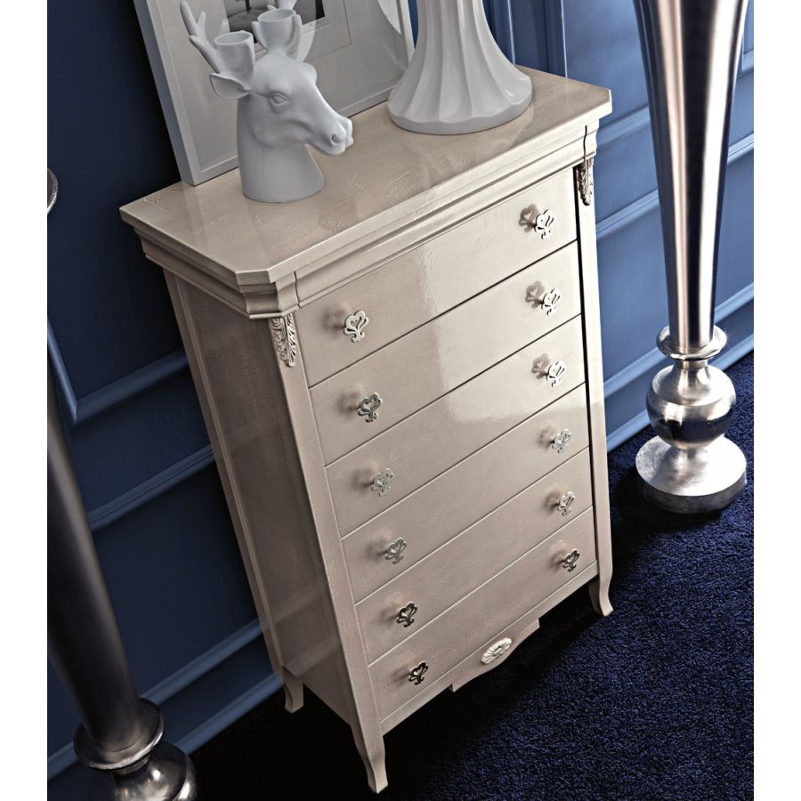 Wooden 3 drawers chest with graceful and classic line.It has straight sides and legs and refined inlaid details. Together with the bedside table of same collection it create a delicate and refined fitting for the bedroom. The wide range of finishings can realize impeccable color effects and contrasts, for unique matchings.