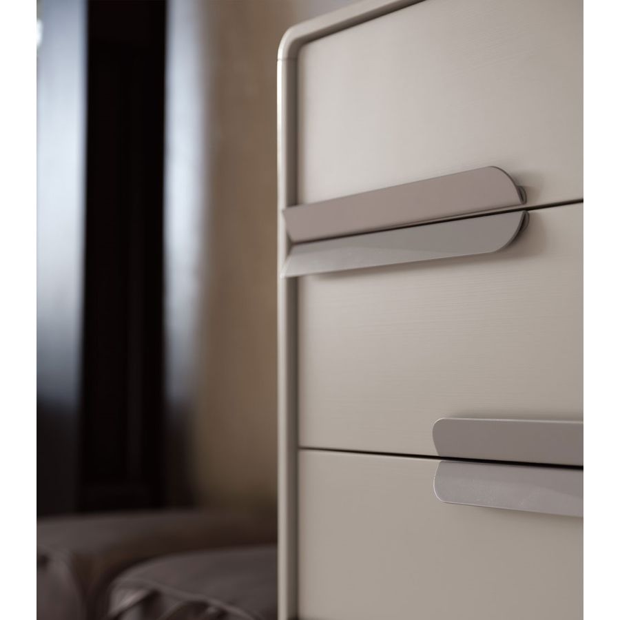 Wooden chest of drawers with 7 drawers with a simple and contemporary line. The rounded shapes of the structure are highlighted by the linearity of the metal handles that form asymmetrical games. The metal base with elliptical section in chromatic combination with the handles, elegantly supports the structure giving it a light and informal look.