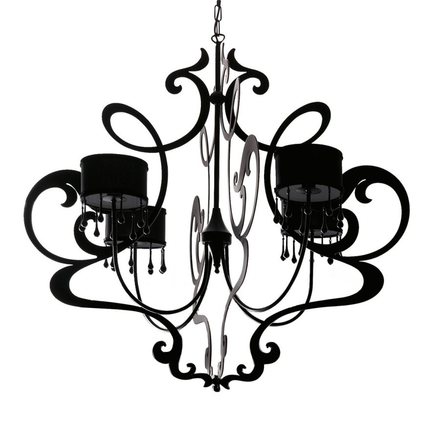 | Material-Iron tube supporting structure. Hand polished ornamental laser cutted iron frame. Fabric lampshade on PVC support with trimming on choice. Coloured or clear glass pendants. Lighting source: Max 6 x 40W E14 220V | |