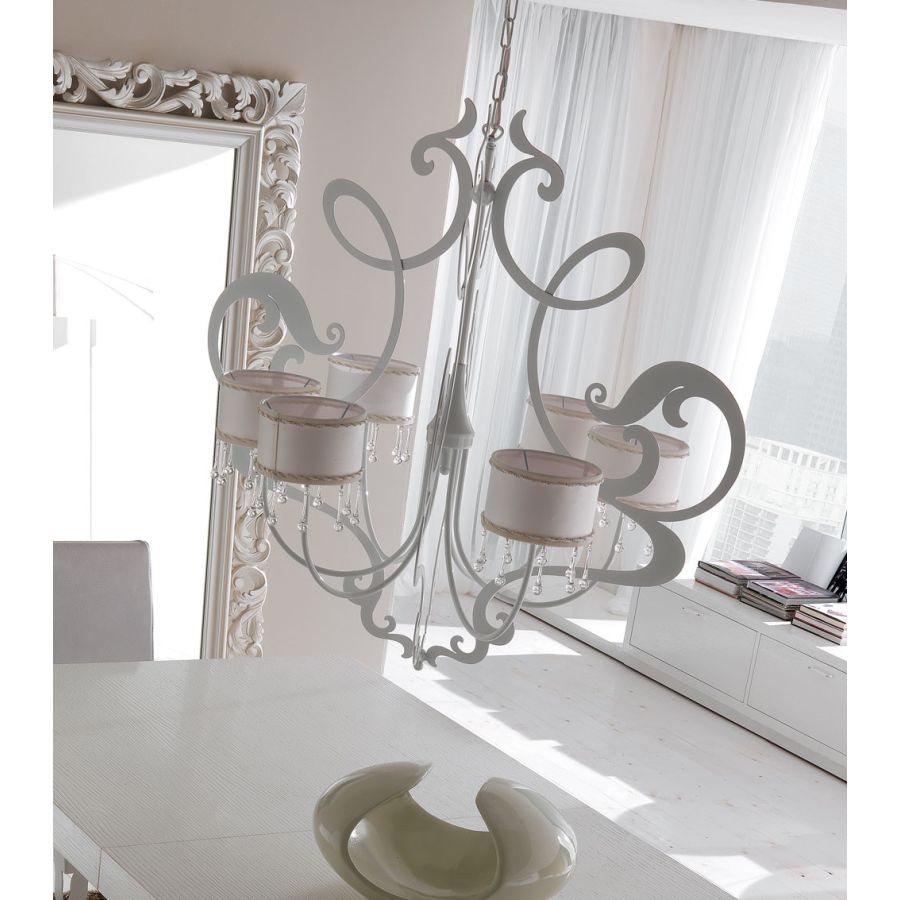 Zoe chandelier rich of curves and spirals is part of a wide collection of lamps, with a glamourous appeal striking a contemporary pose. An emotional object to be tailored at each time thanks to the combination of fabrics and finishings.