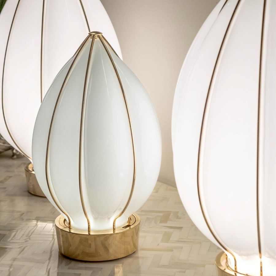 The LA Cordless Table Lamp has been designed by Camilla Bellini for Italamp. LA is a cordless lamp where light and sound become one: in fact, its name recalls the musical note LA, which the lamp reproduces when it is turned on. The lamp comes to life in a light gold metal cage inside of which is a white glass bud made with the technique of "cage blowinng".