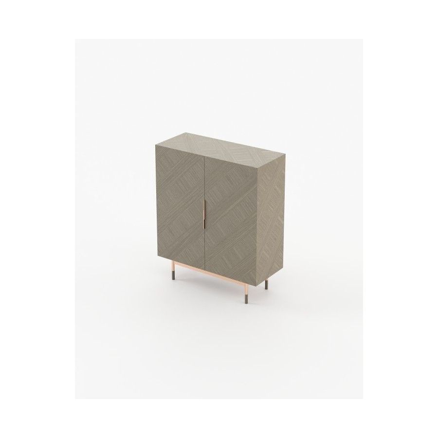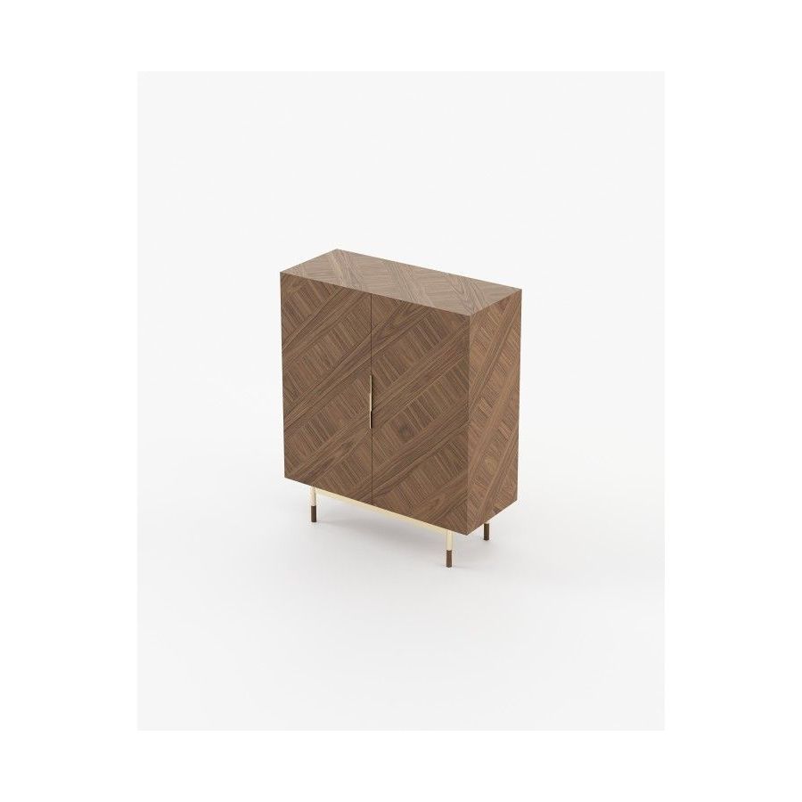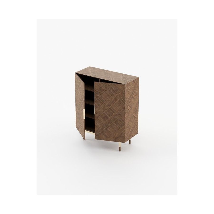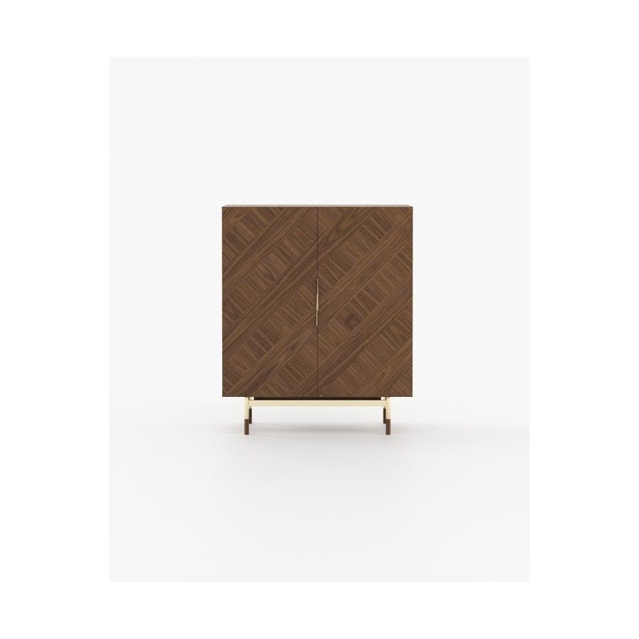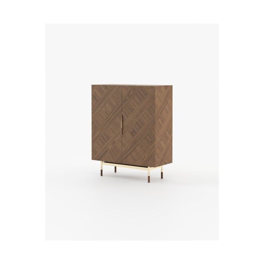 Claud cupboard is ideal for storing glassware or exclusive liquors. This vintage style cabinet features a gold structure and two doors with metal handles. This extremely versatile cabinet has a striking geometric wood body, perfect to any living or dining room.