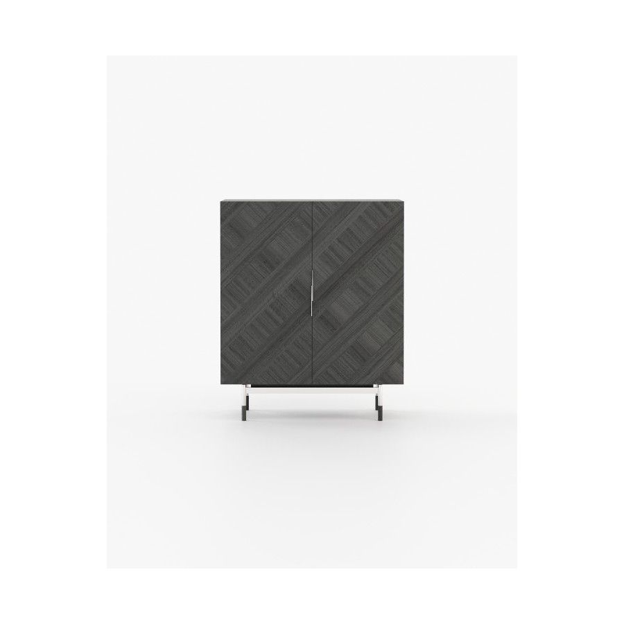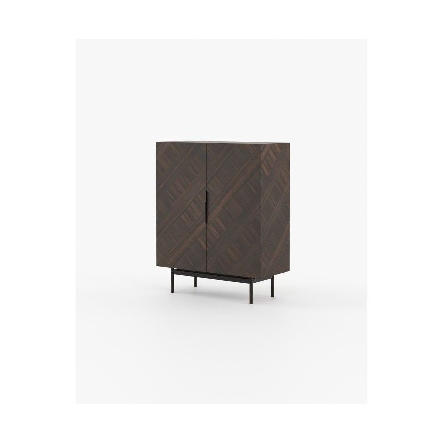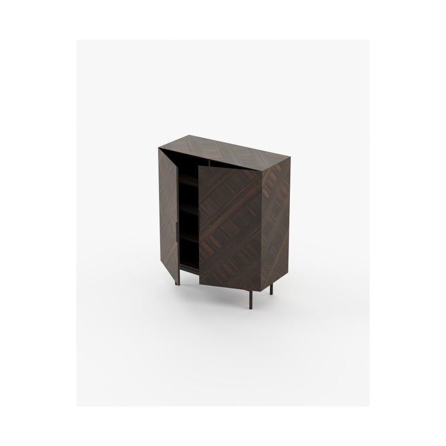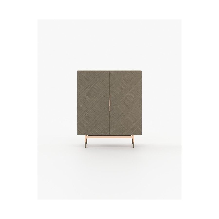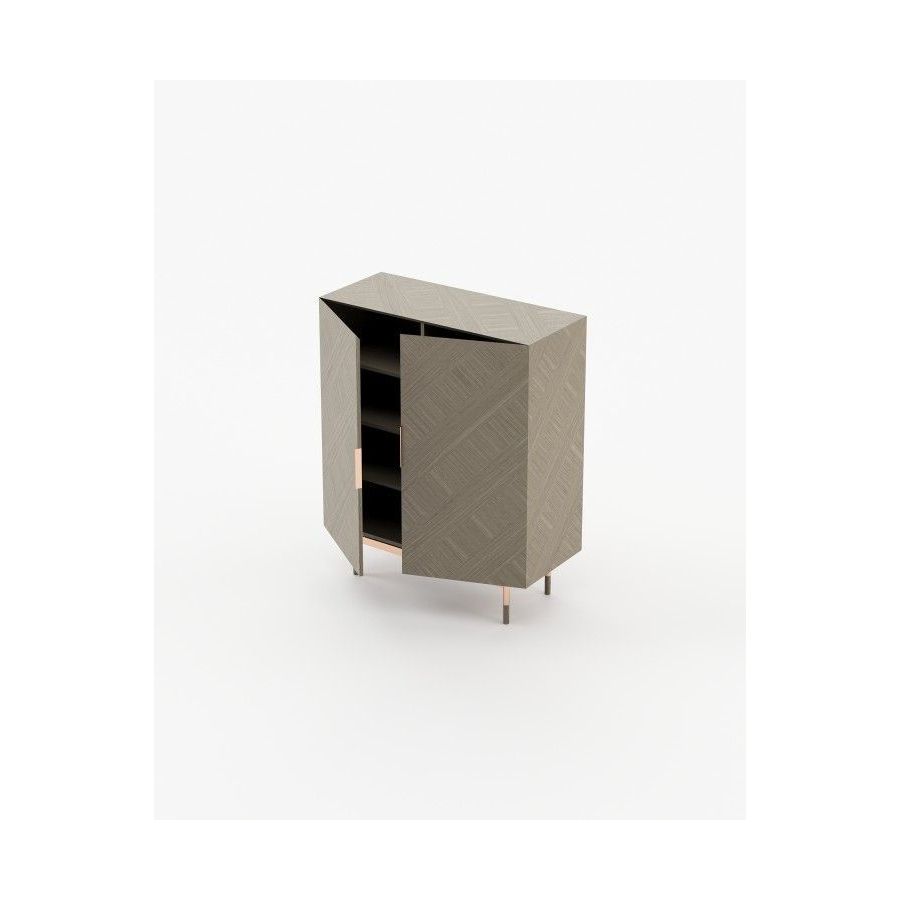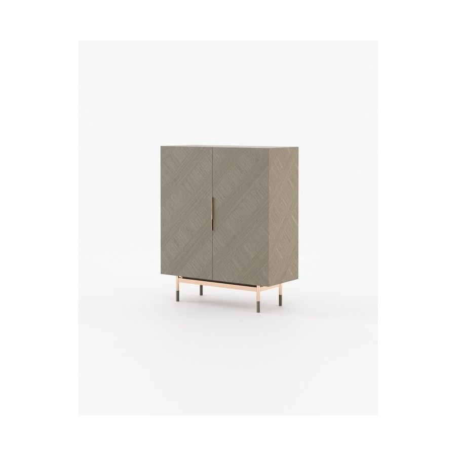 Claud cupboard is ideal for storing glassware or exclusive liquors. This vintage style cabinet features a gold structure and two doors with metal handles. This extremely versatile cabinet has a striking geometric wood body, perfect to any living or dining room.