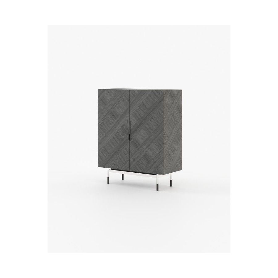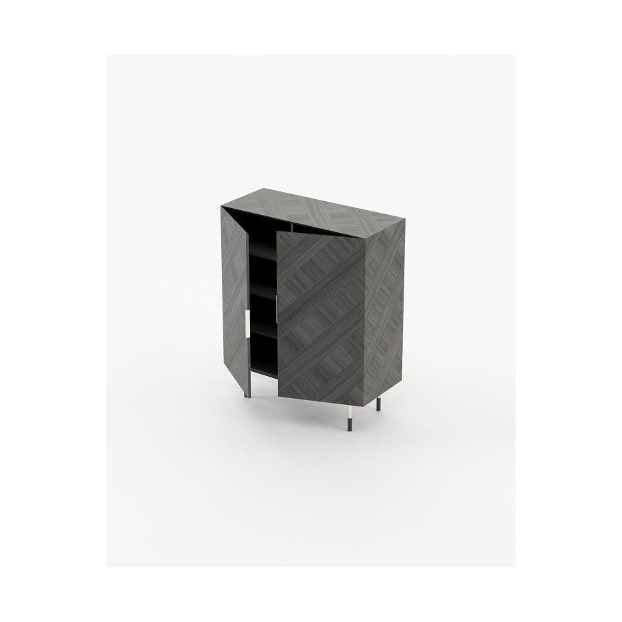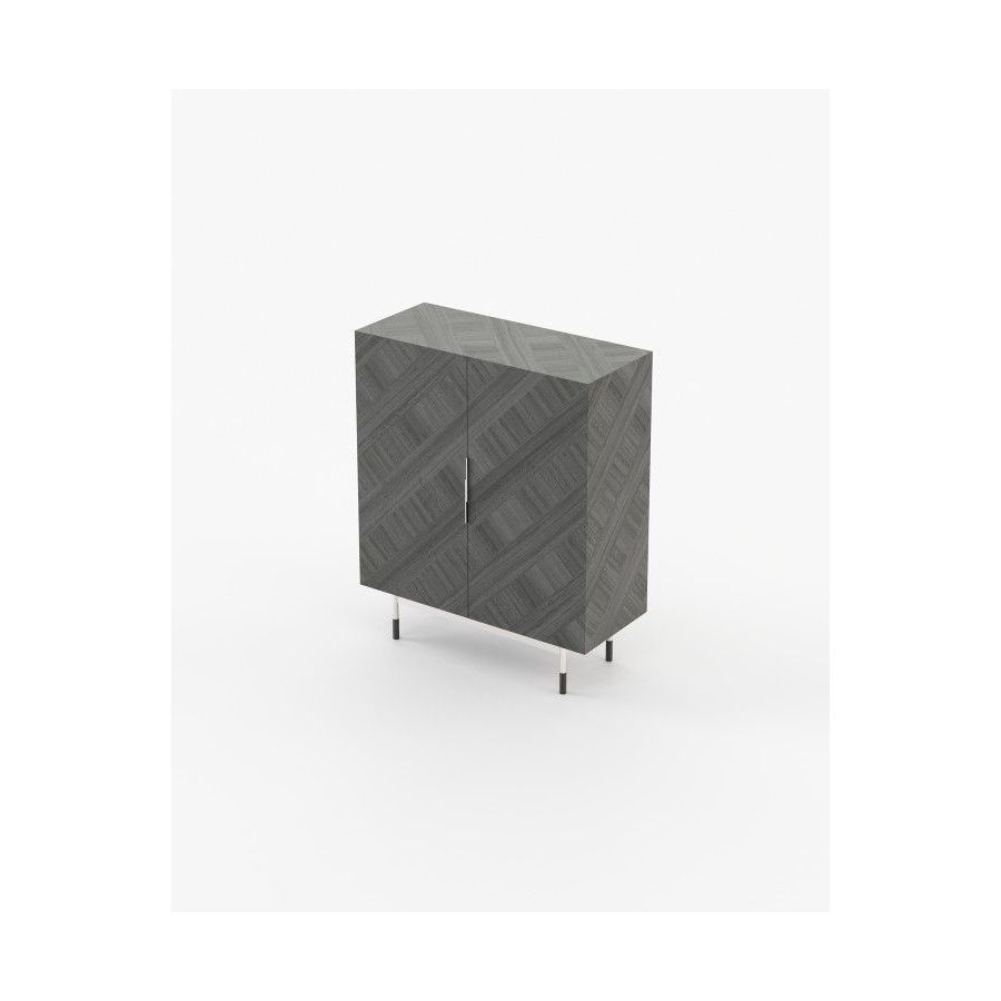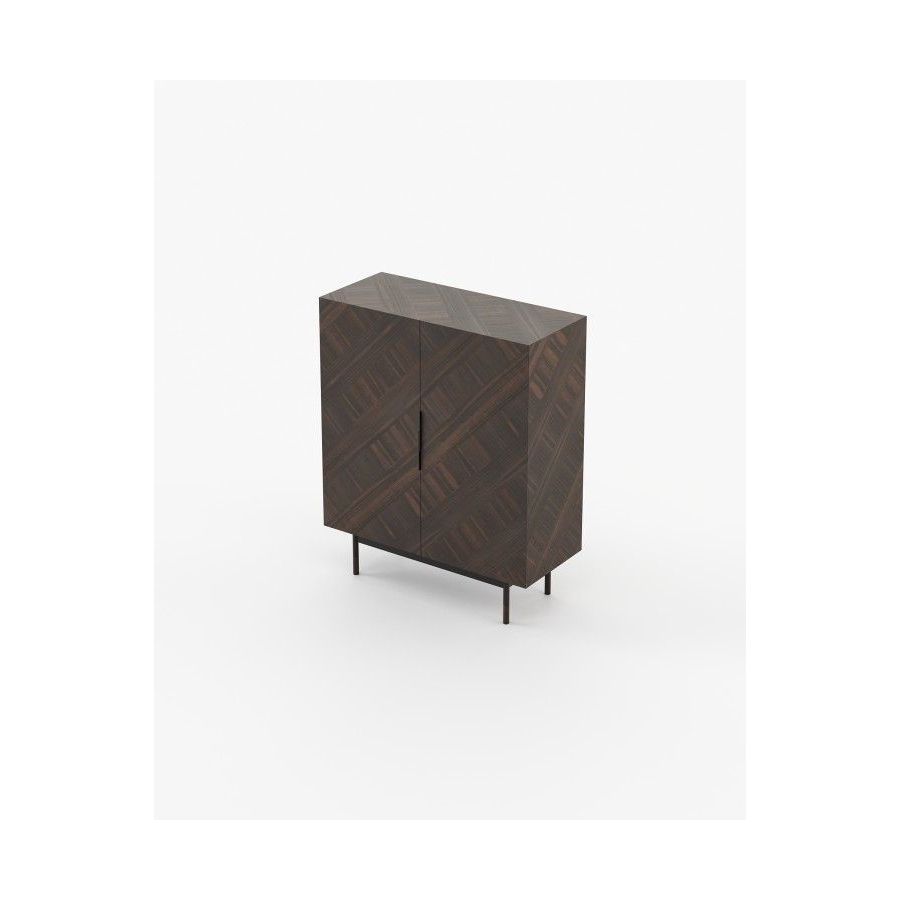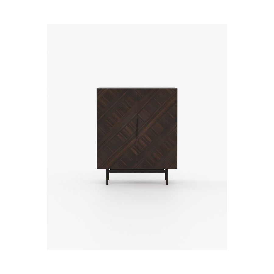 Claud cupboard is ideal for storing glassware or exclusive liquors. This vintage style cabinet features a gold structure and two doors with metal handles. This extremely versatile cabinet has a striking geometric wood body, perfect to any living or dining room.