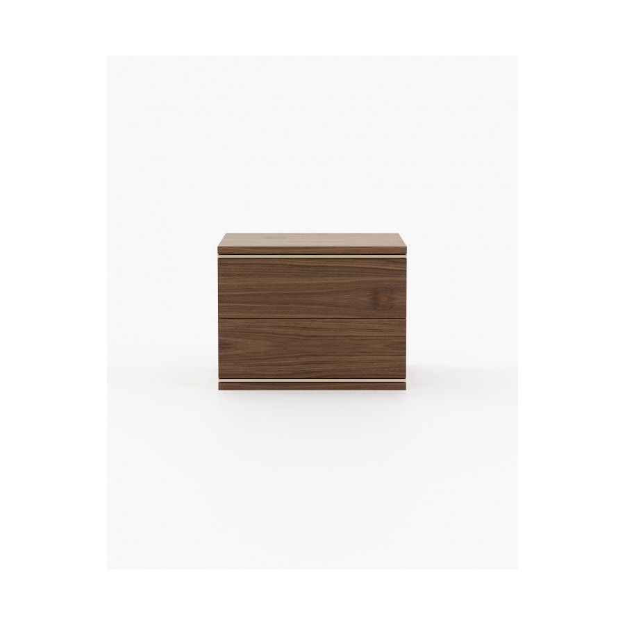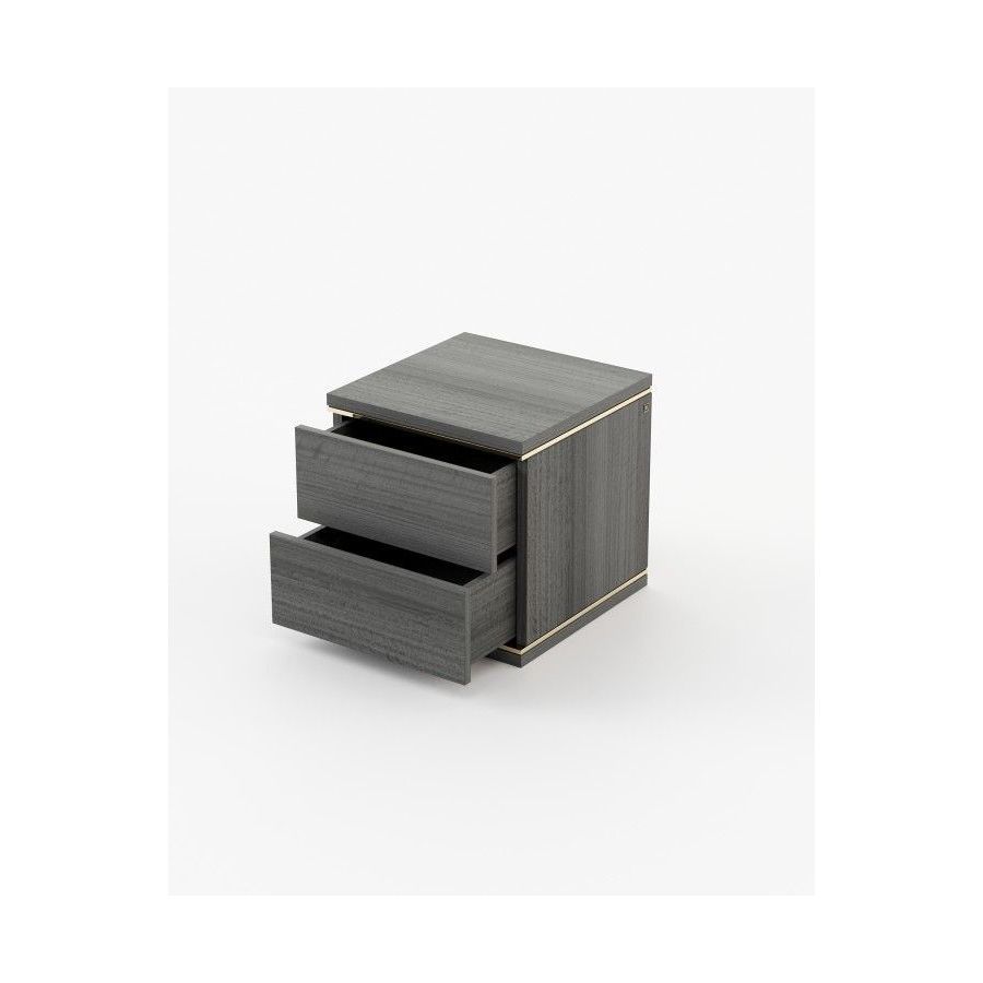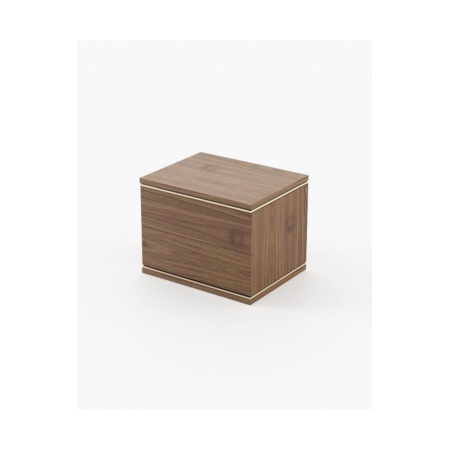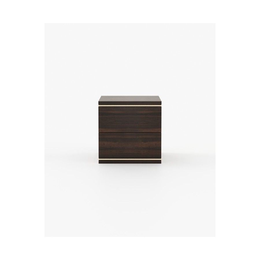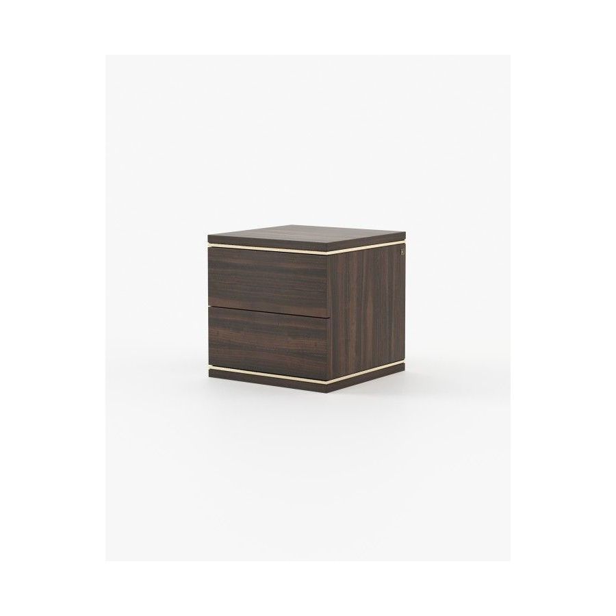 The Duane bedside table is a classic nightstand that adds elegance and style to any bedroom, featuring two handless soft-closing drawers and contrasting metallic details.