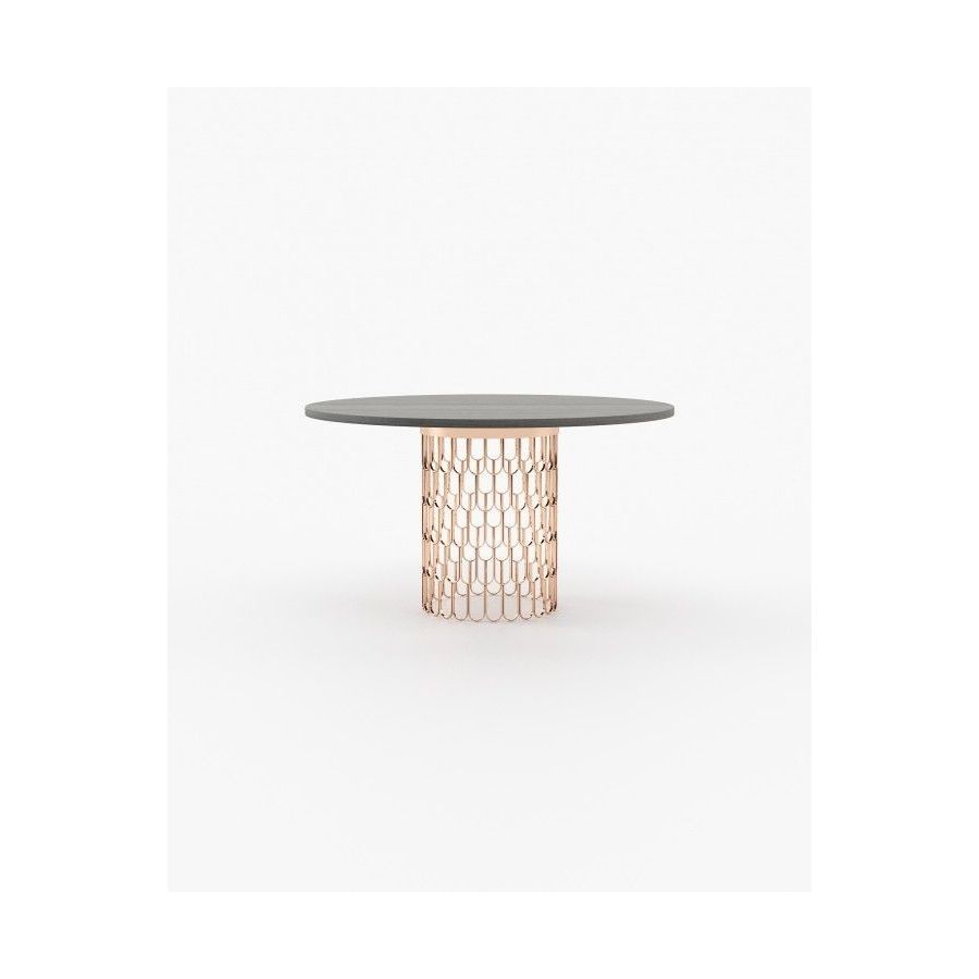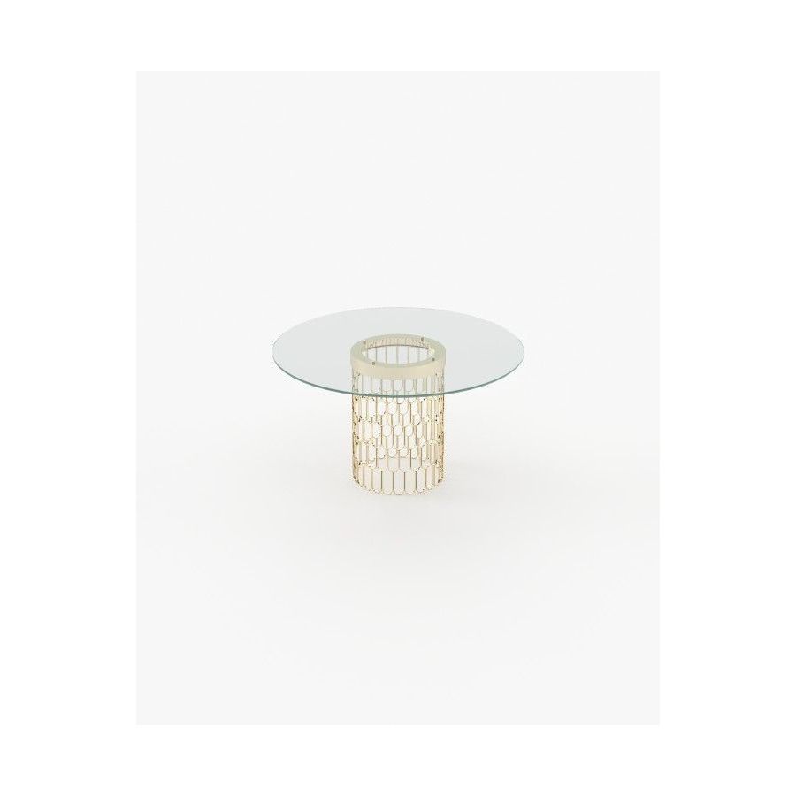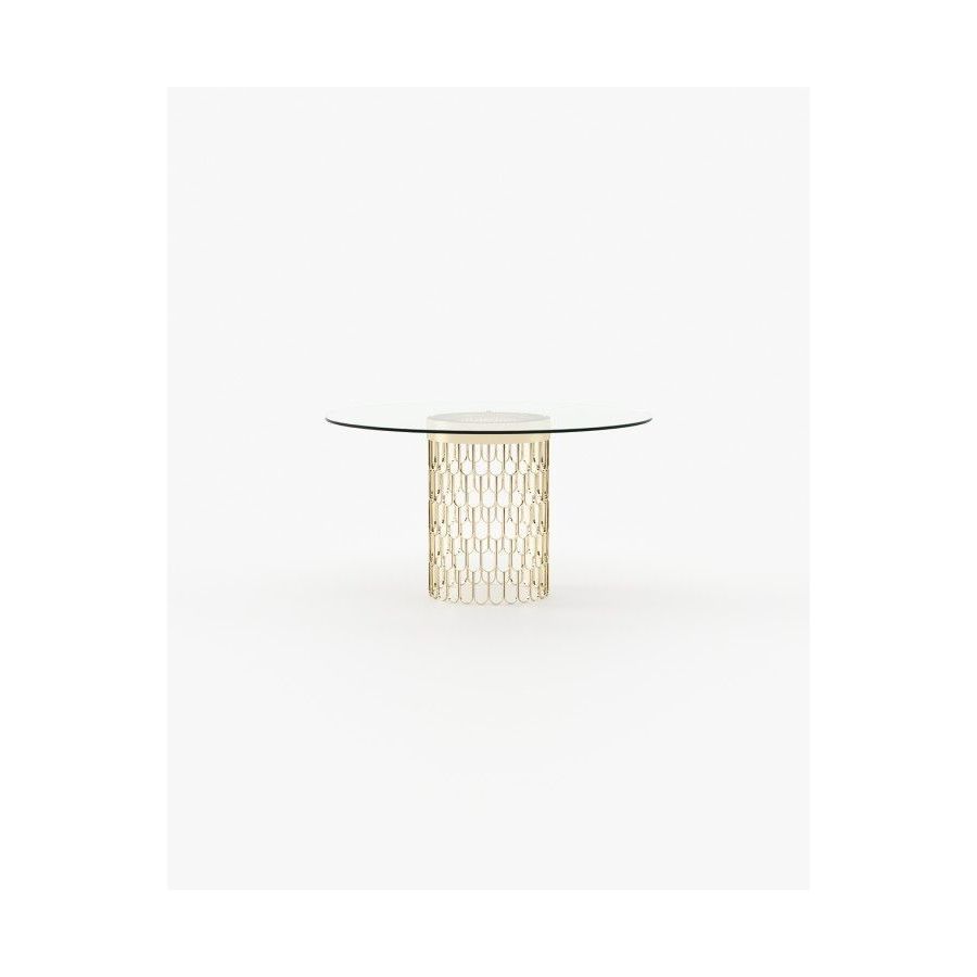 Brenda dining table is a glamorous piece, designed for modern dining rooms. The round glass countertop sits atop a stunning cylindrical structure.
