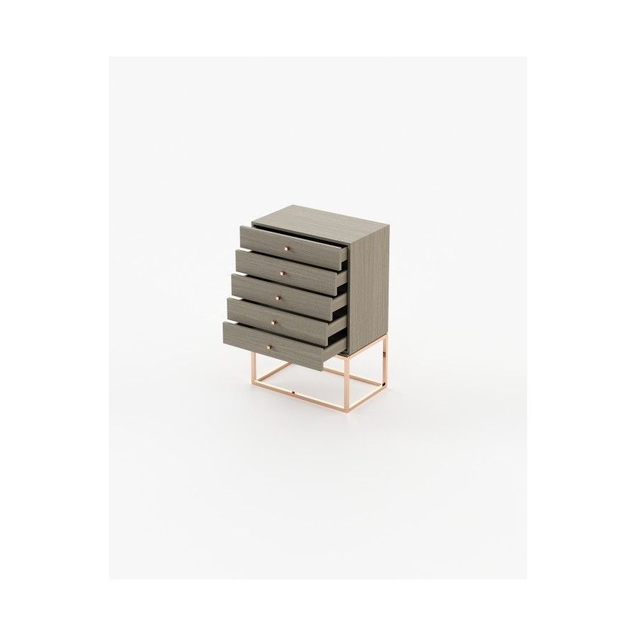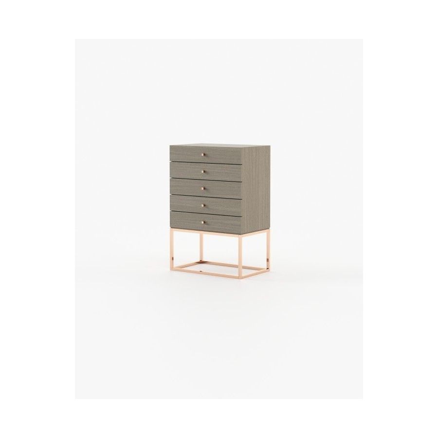 The Ester tallboy is a romantic piece for timeless aesthetic bedrooms, featuring five sleek drawers supported by a striking metal structure, providing balance to the bedroom with a graceful touch.