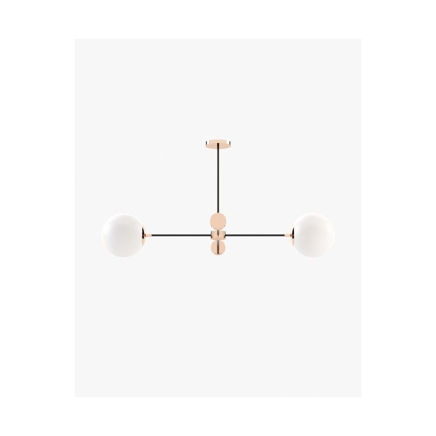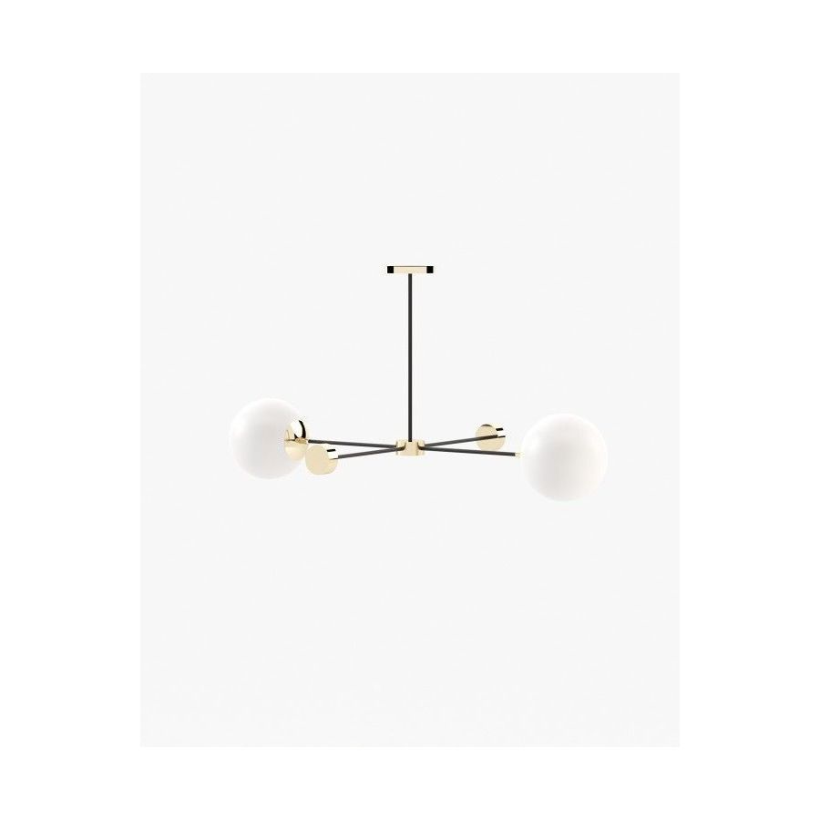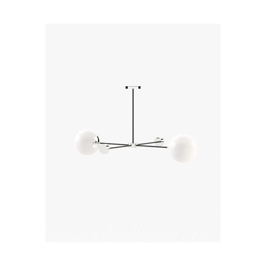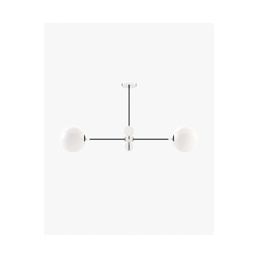 Janis suspension lamp features a stainless steel ceiling support and is inspired by the beauty of bubbles. It features two round white bulbs pointing in different directions, making it a unique and non-conventional pendant for modern mid-century decoration.