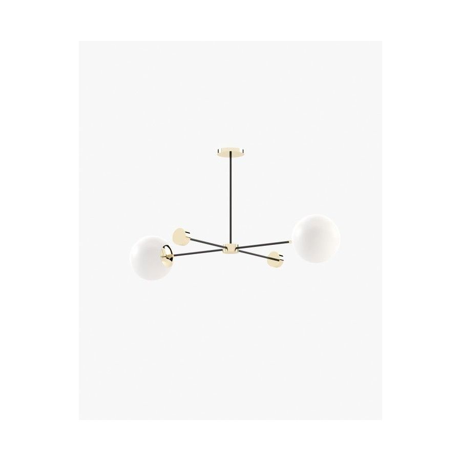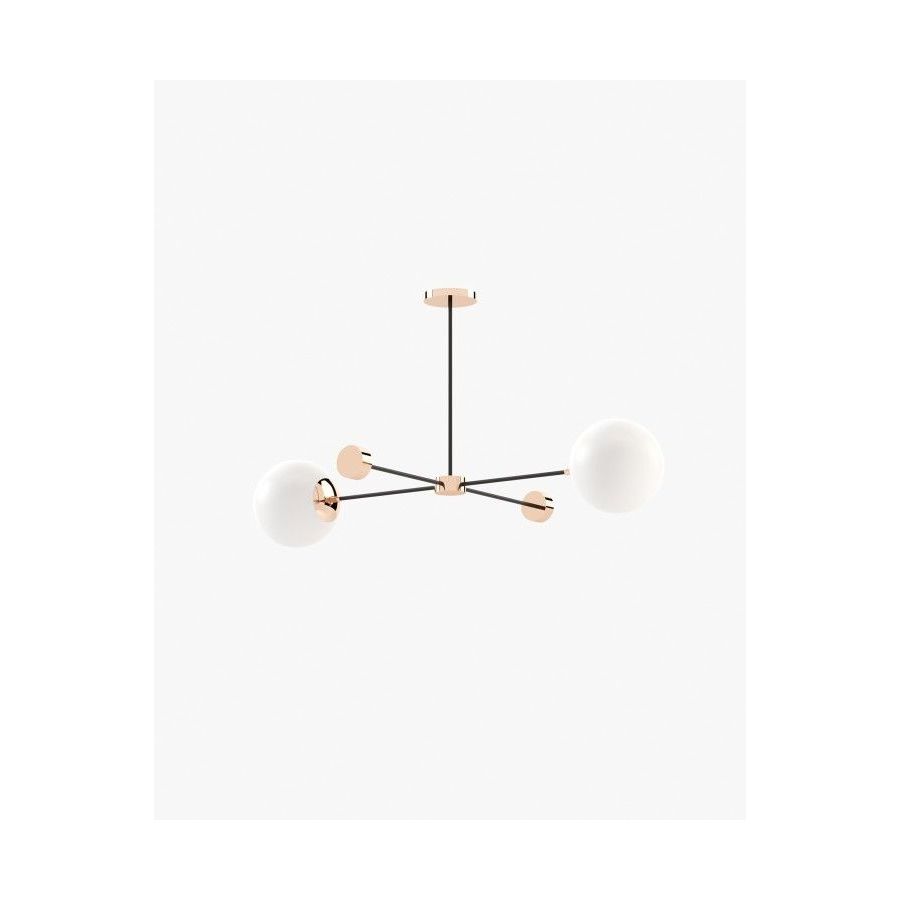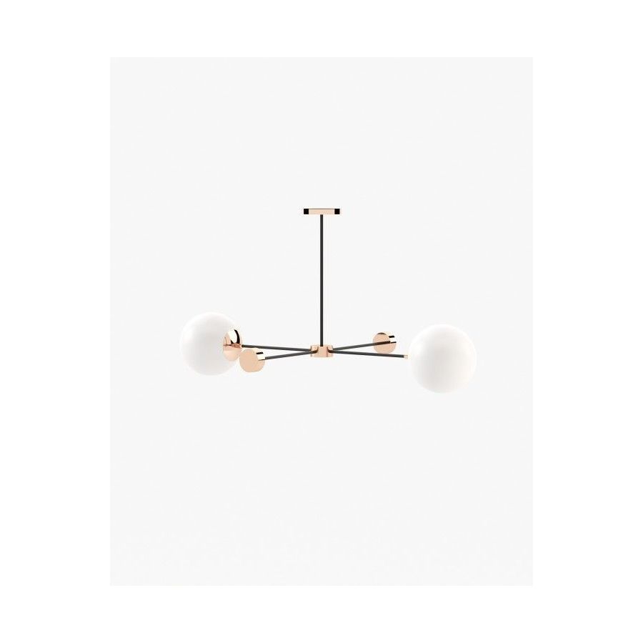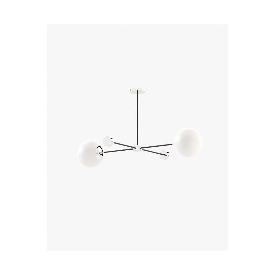Janis suspension lamp features a stainless steel ceiling support and is inspired by the beauty of bubbles. It features two round white bulbs pointing in different directions, making it a unique and non-conventional pendant for modern mid-century decoration.