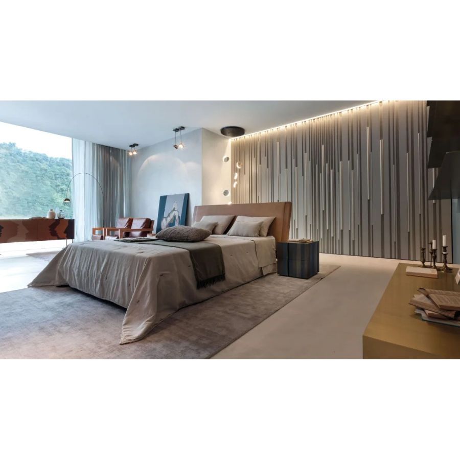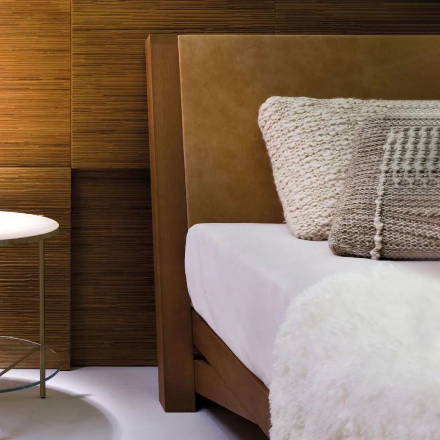 Headboard available in leather, in matt 'Lario' or shiny 'Roxana' velvet, and in fabric.
