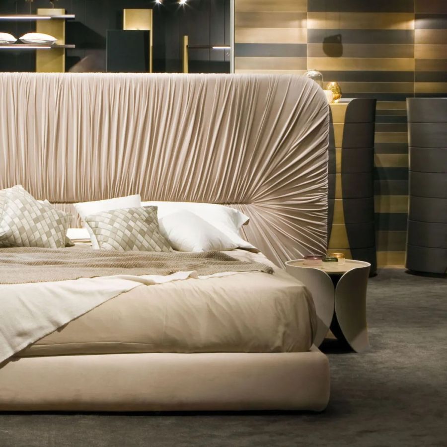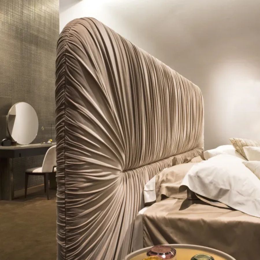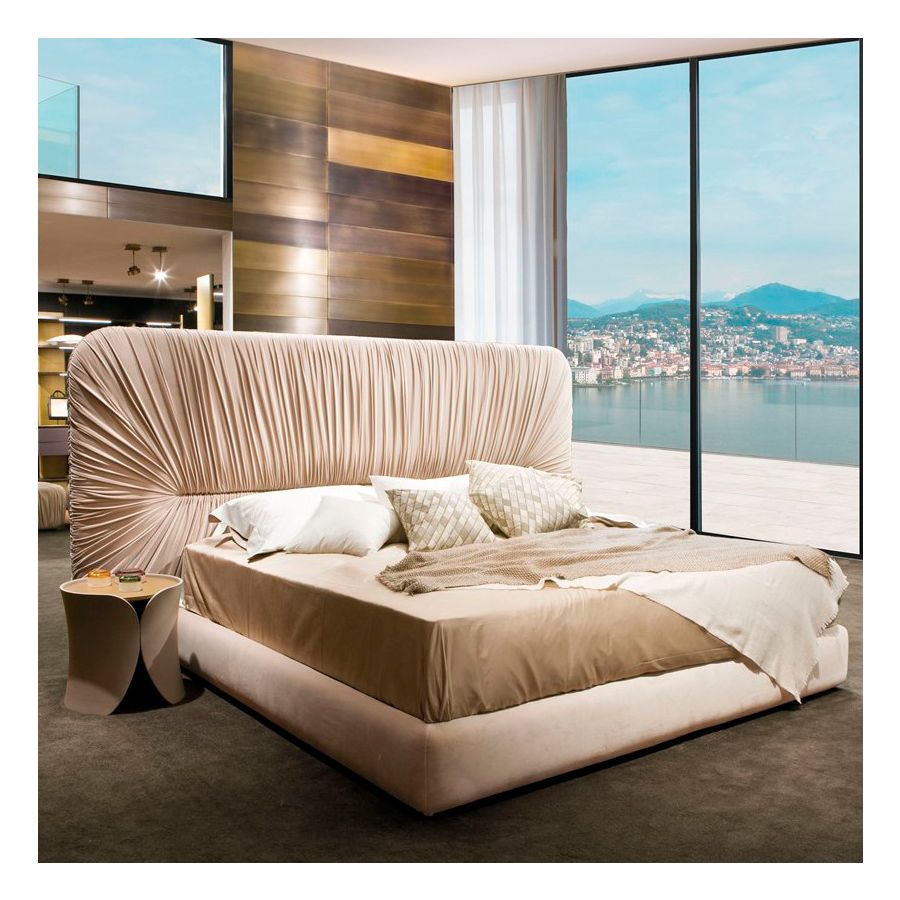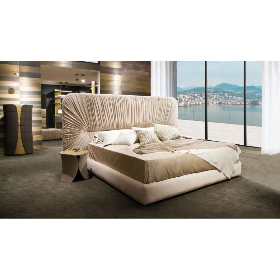 Double bed with padded headboard covered with in a soft drapery made in leather, matt 'Lario' or shiny 'Roxana' velvet, or in fabric.