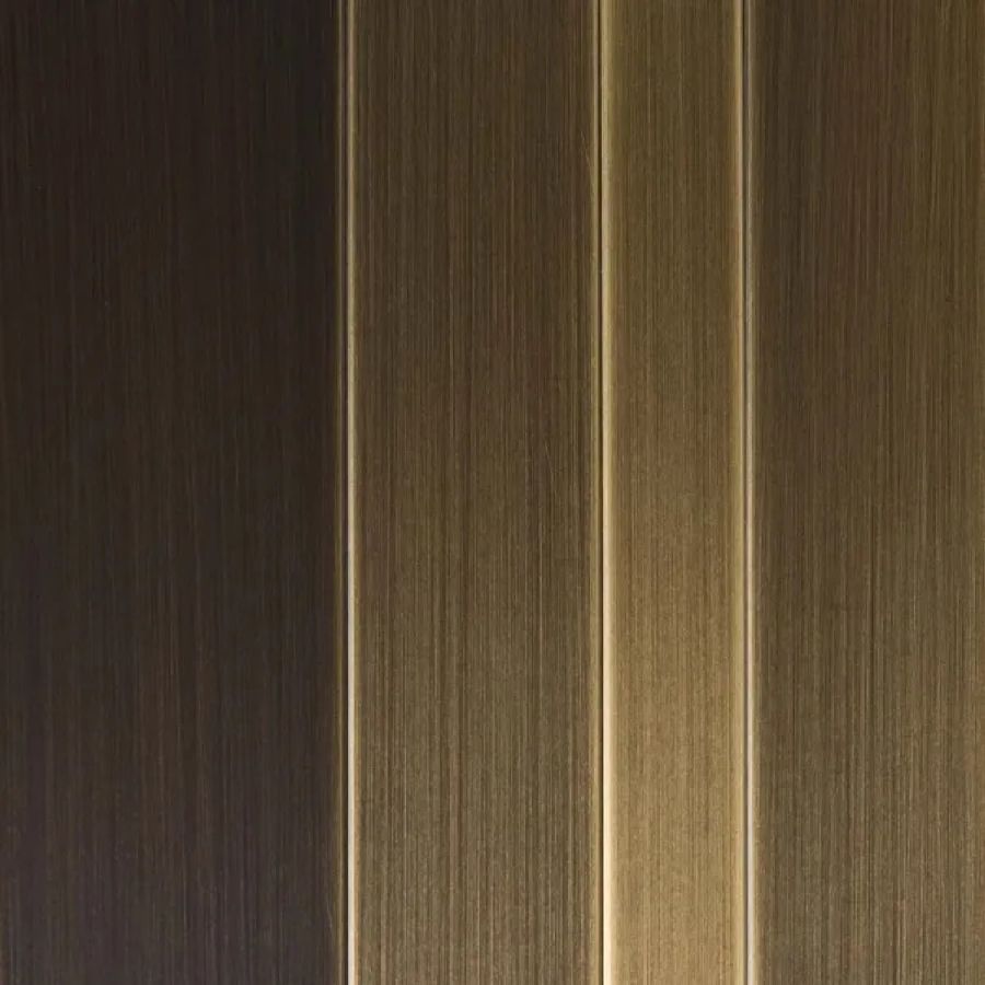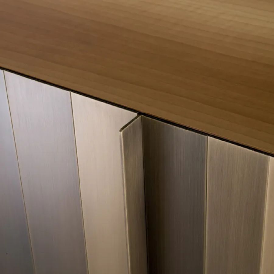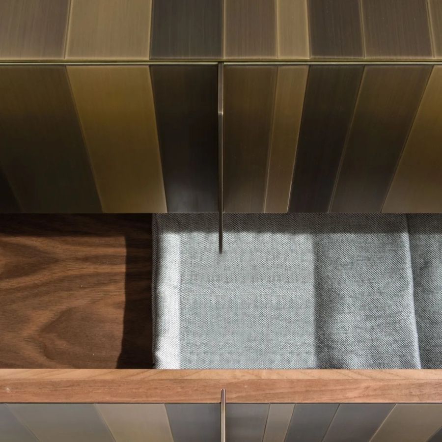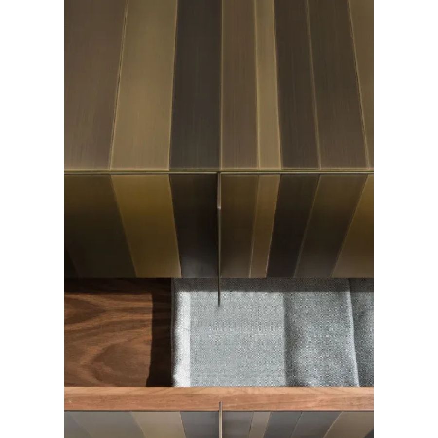 Bedside table with three drawers and structure covered in a sequence of metal bands. Interior in walnut Colore and black matt lacquered plinth.