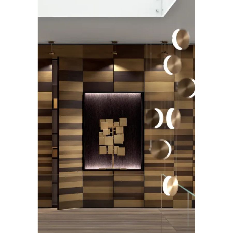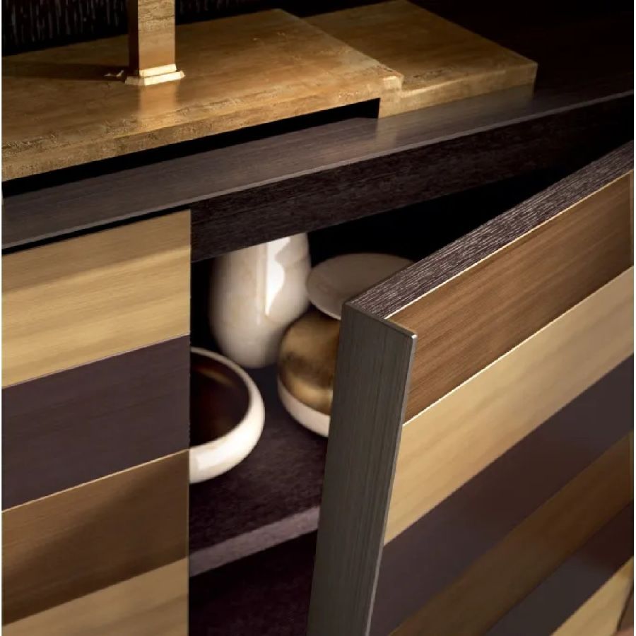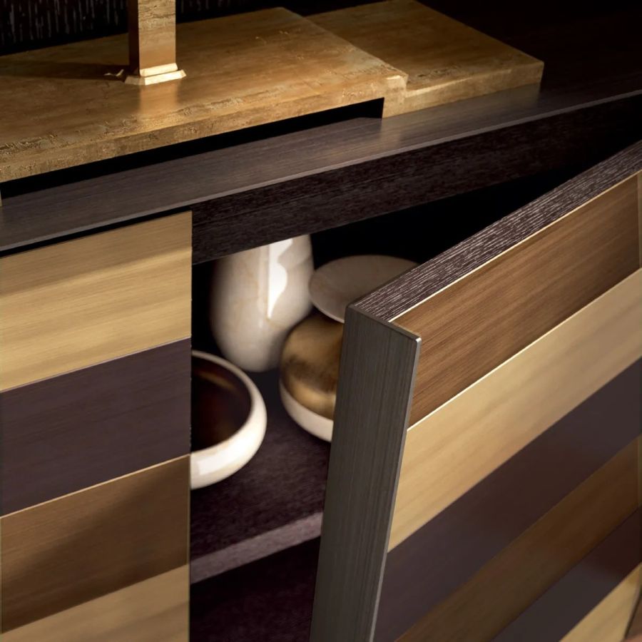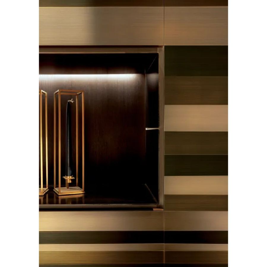 Cabinet system for the living area clad in a sequence of metal bands. Available in modules of different sizes, with customized niches and accessories, and with integrated LED lighting.