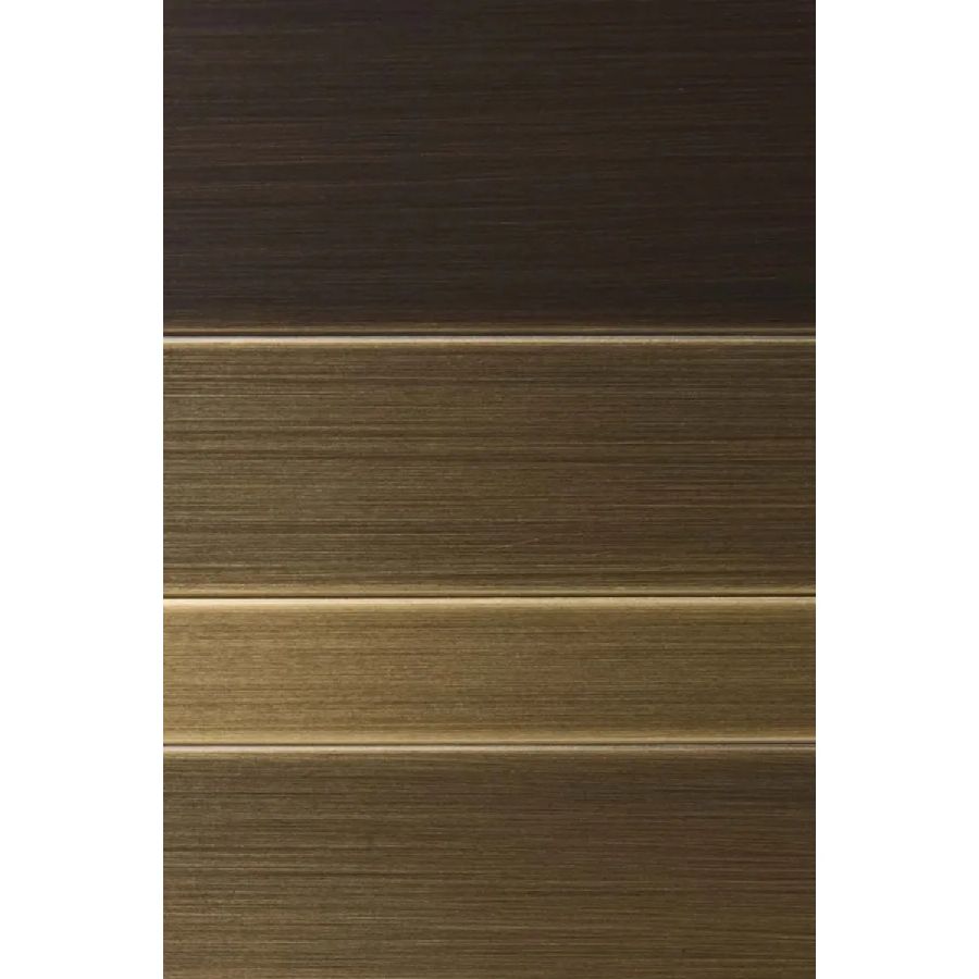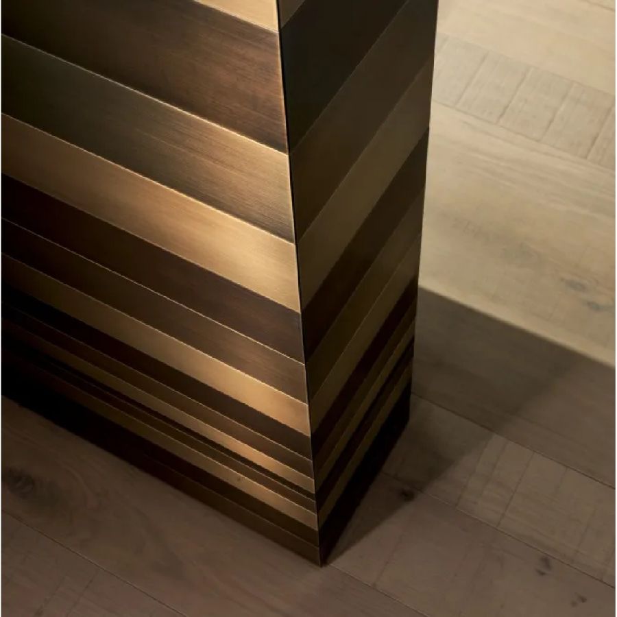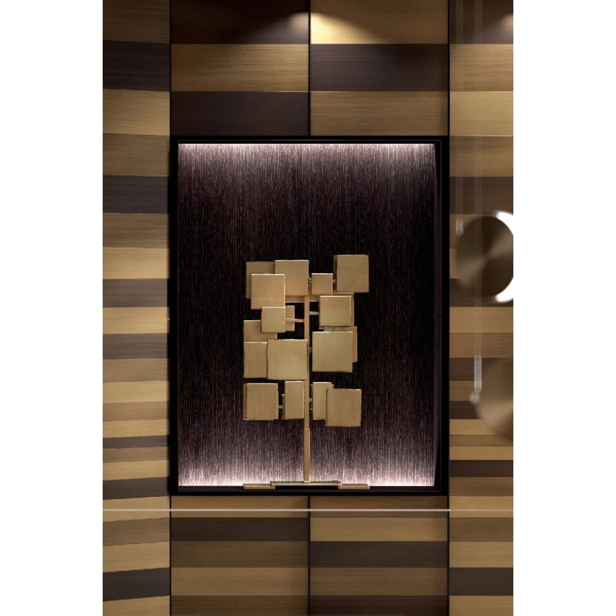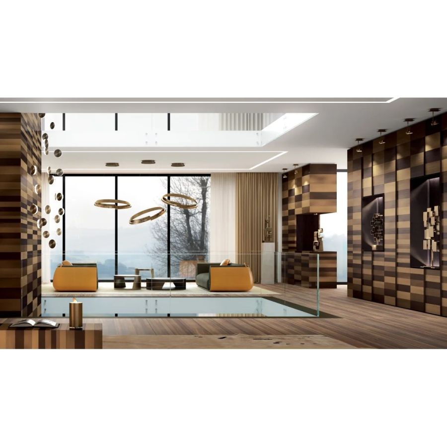 Cabinet system for the living area clad in a sequence of metal bands. Available in modules of different sizes, with customized niches and accessories, and with integrated LED lighting.