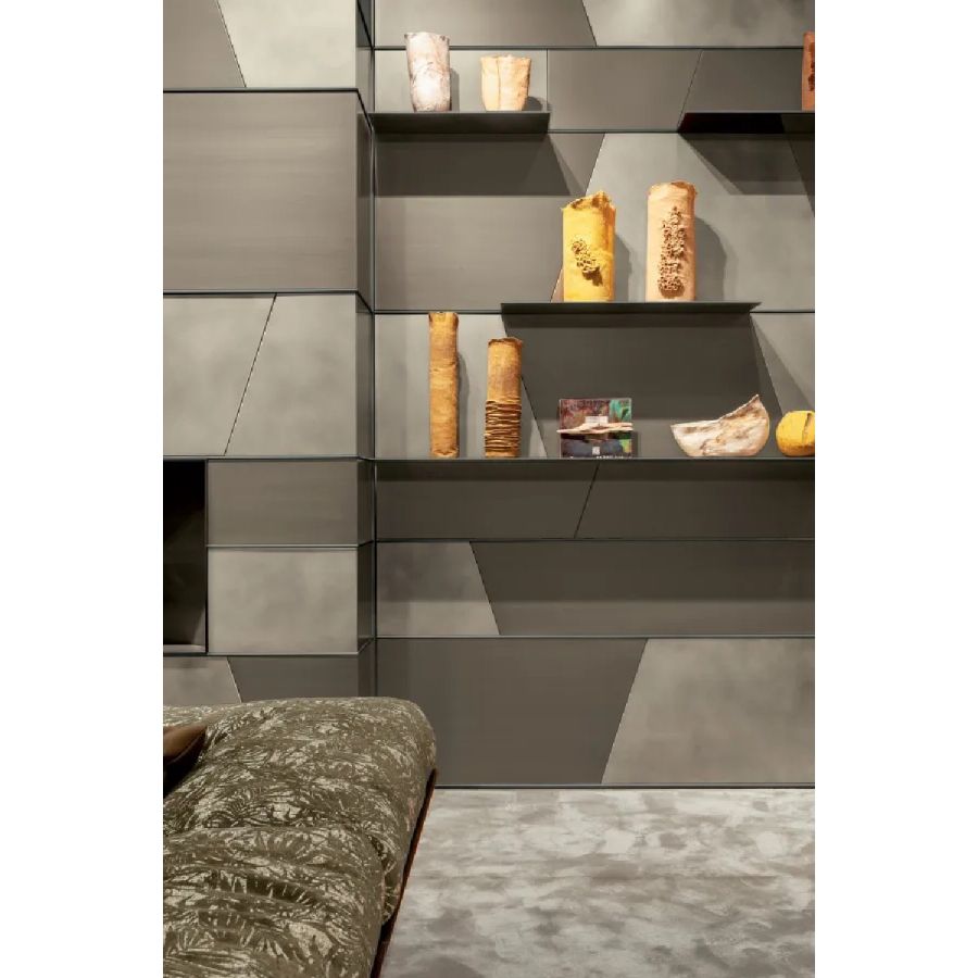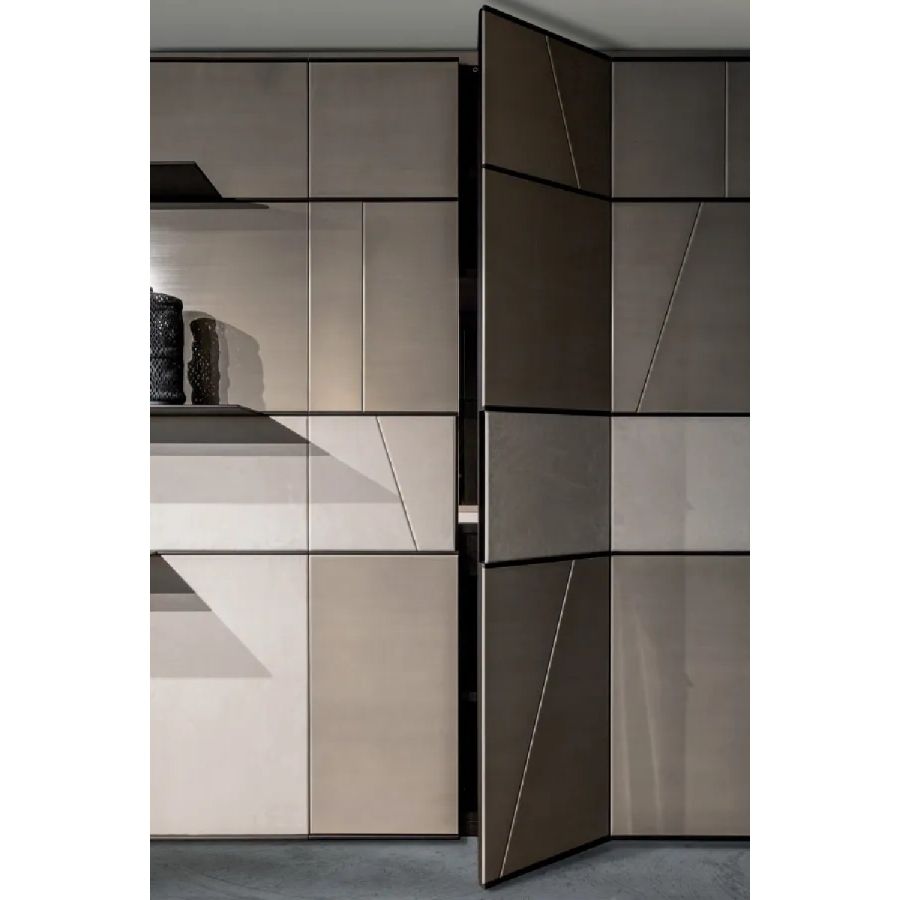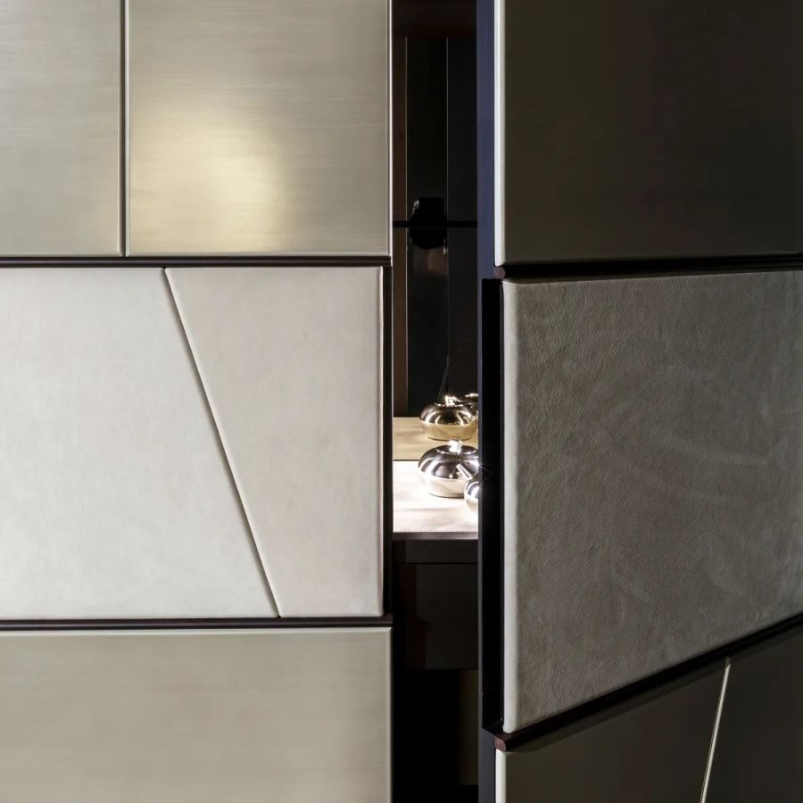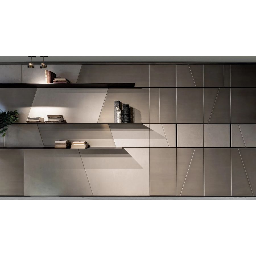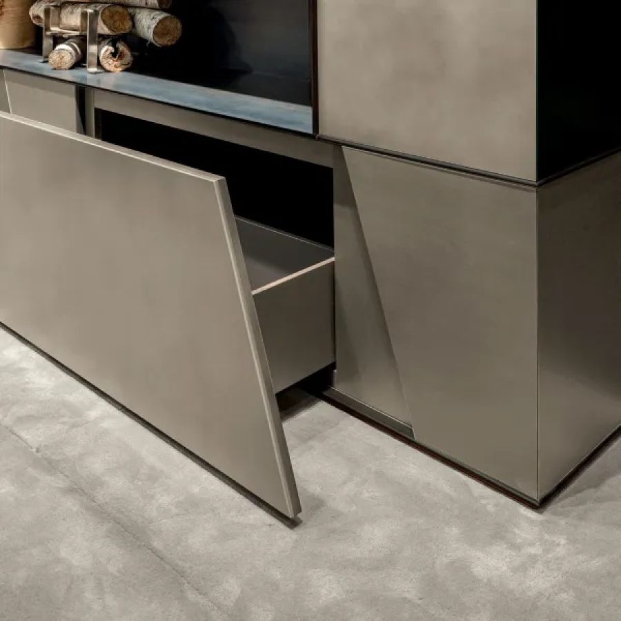 Customizable in all the essences of the collection, lacquered and aniline dyed in all RAL colours or in leather, the Terre cabinet system is available in combination with integrated wall panels and doors.