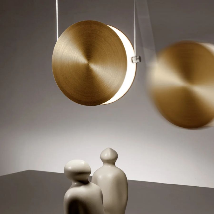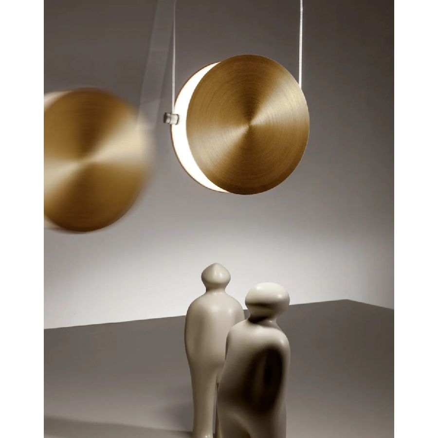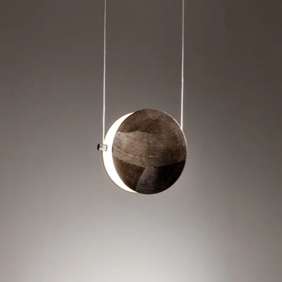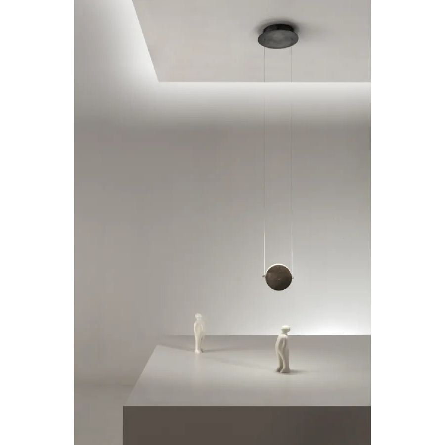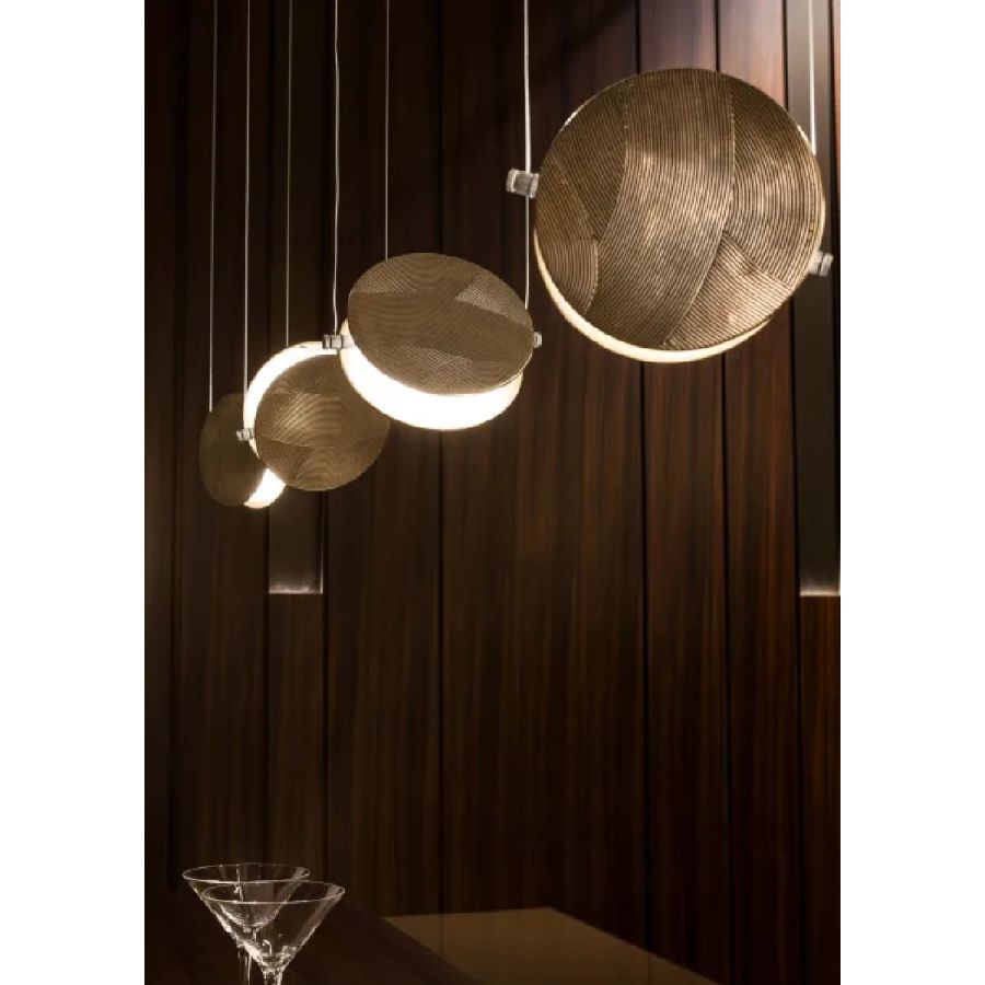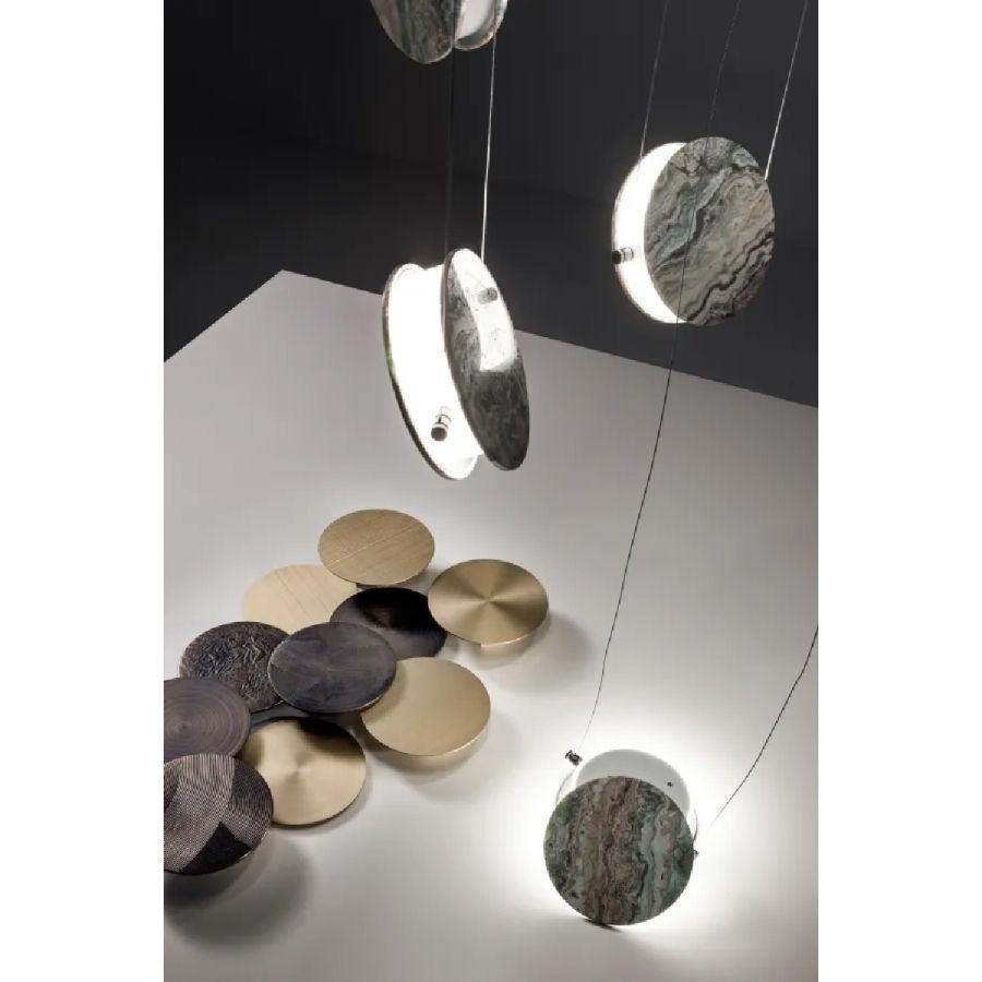 Pendant lamp with dark bronze rose, steel cables and interchangeable disc-shaped magnetic covers.
