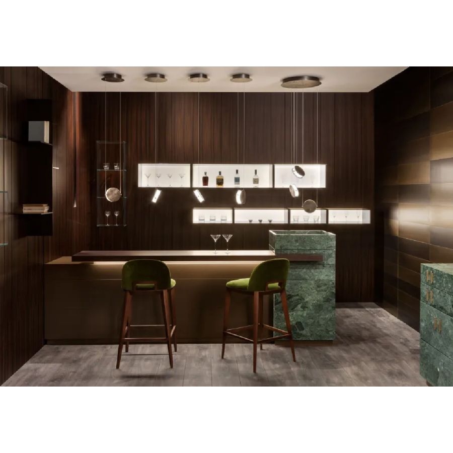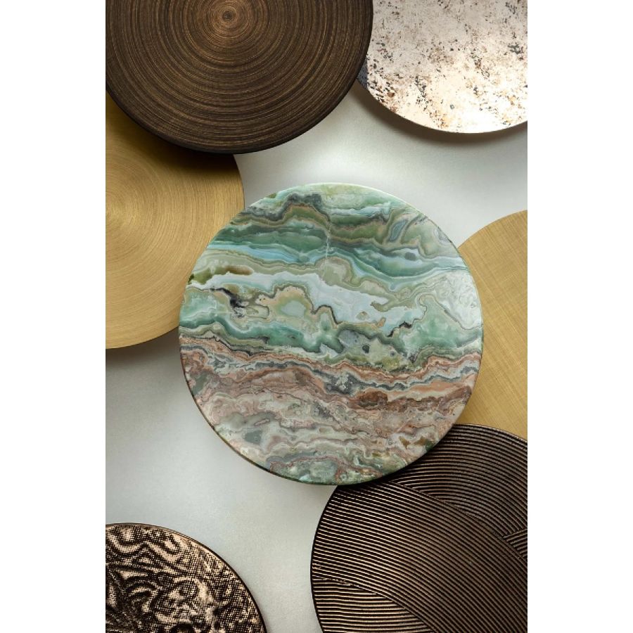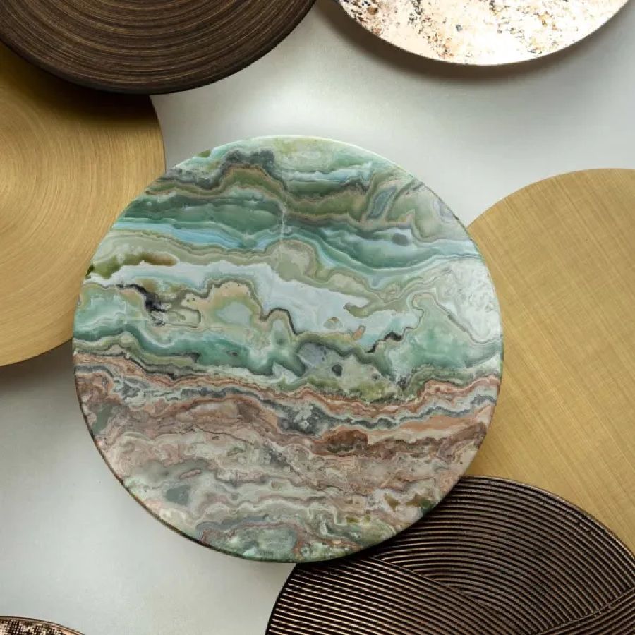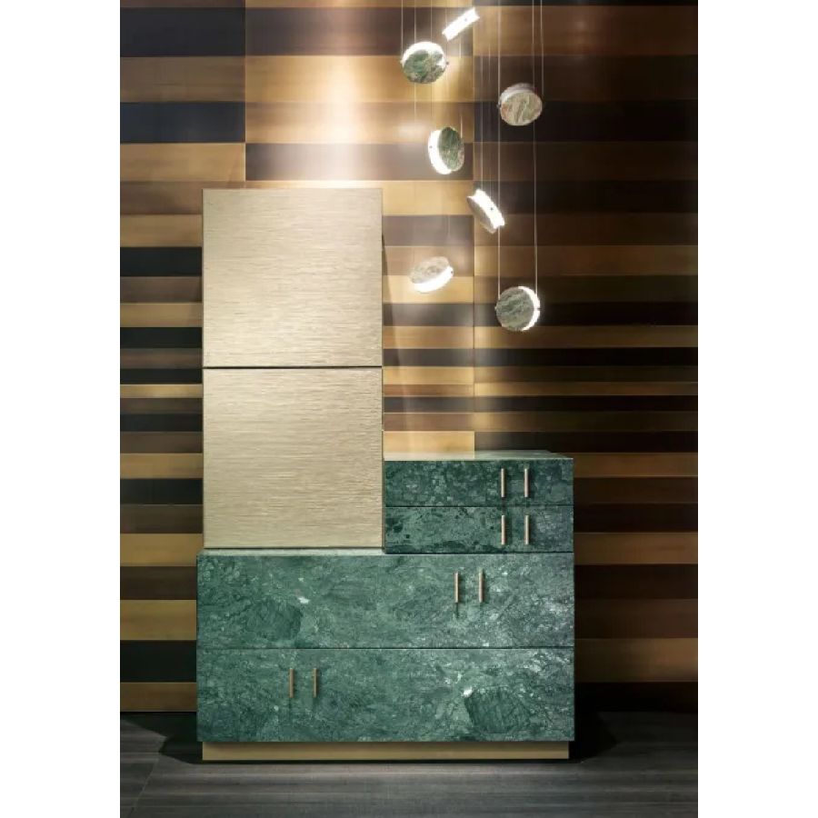 Available in customized configurations and with covers in 'spatolato' liquid metal bronze, 'carta' liquid metal bronze, oxidized silver, circular burnished brass, circular satin brass, 'tessuto' satin brass and green onyx.