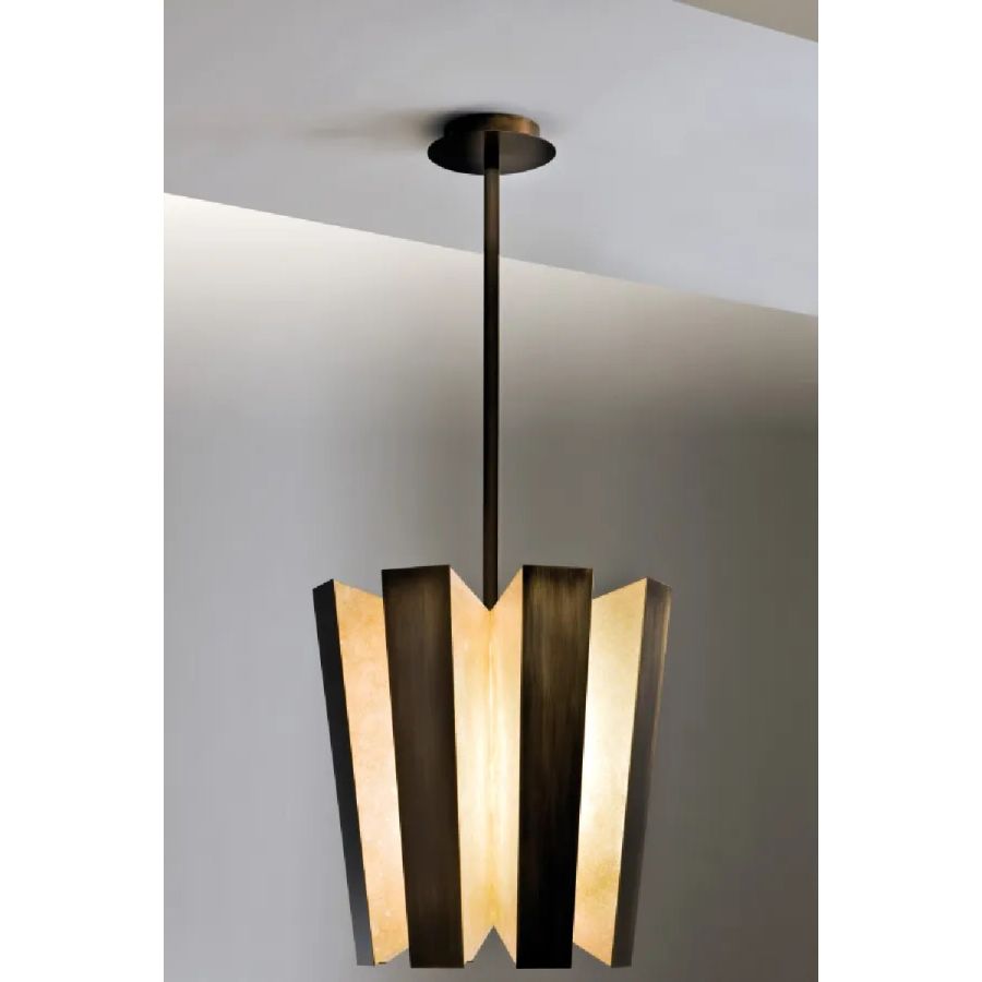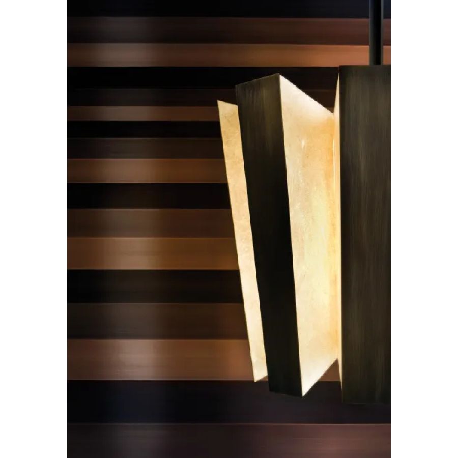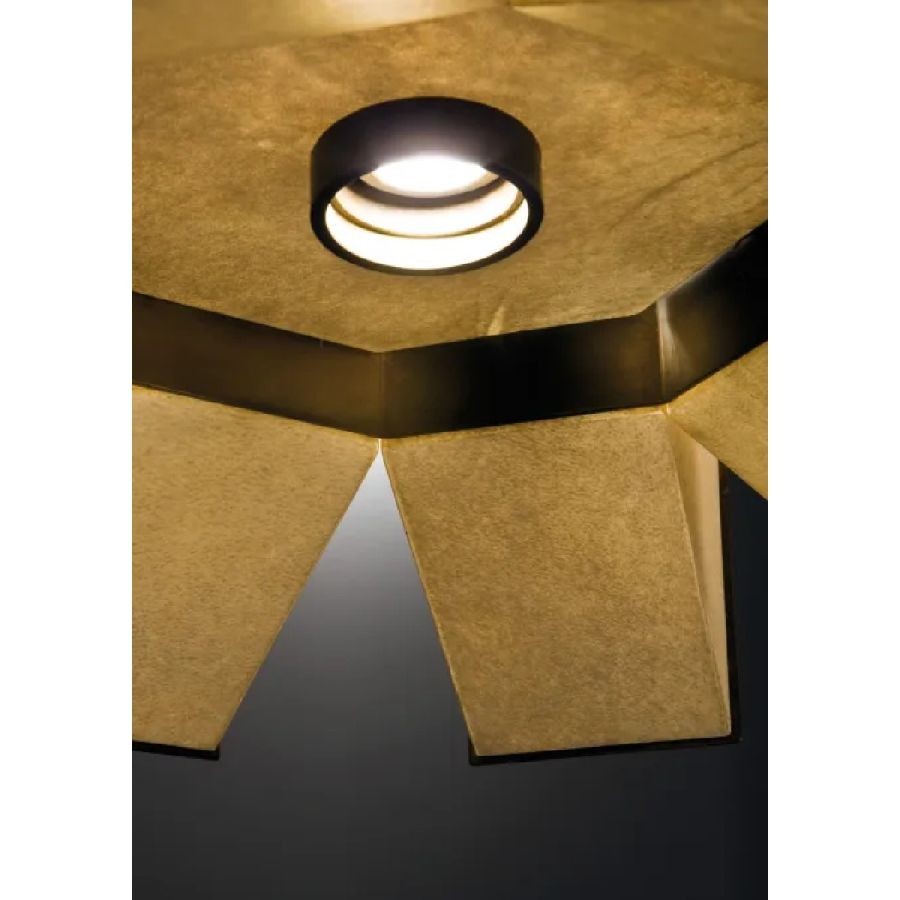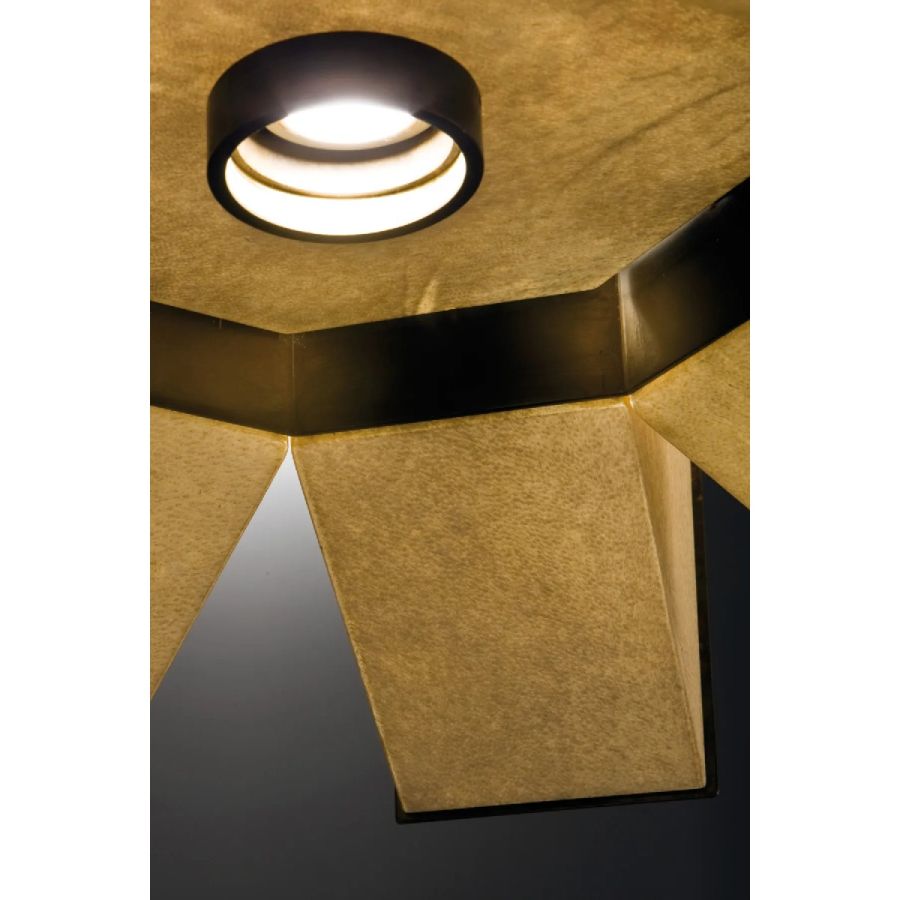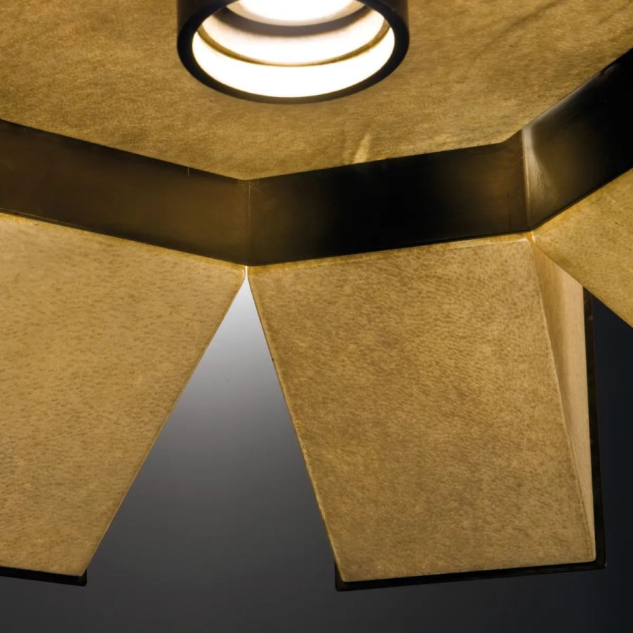 LED suspension lamp in methacrylate, composed of eight luminous elements in burnished brass and in goat parchment.