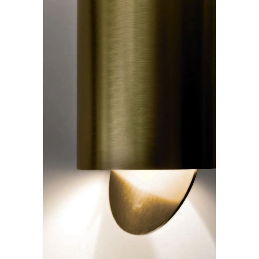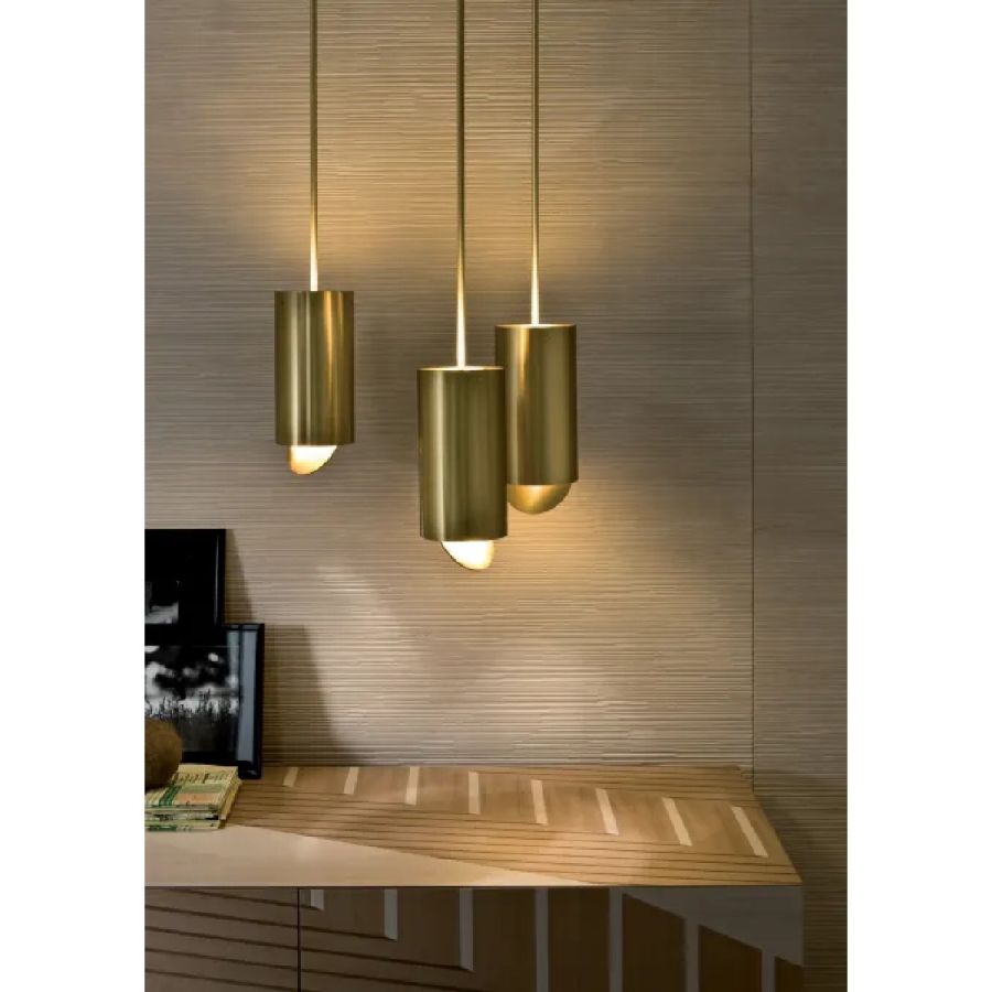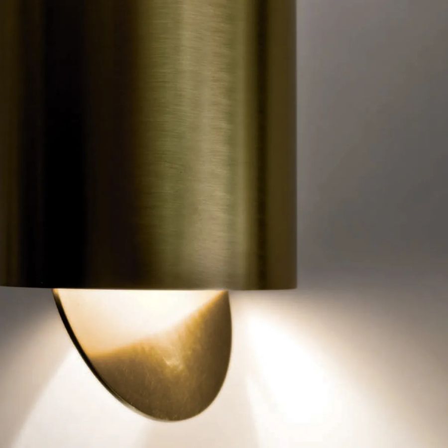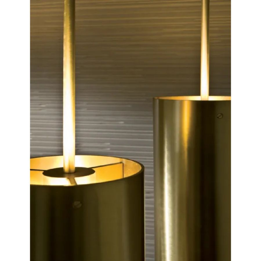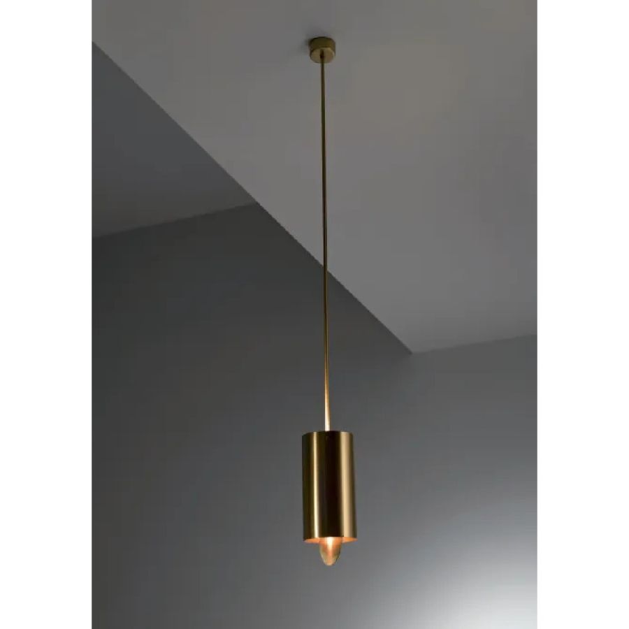 Tubular pendant lamp with satin brass structure and adjustable lower disc.
