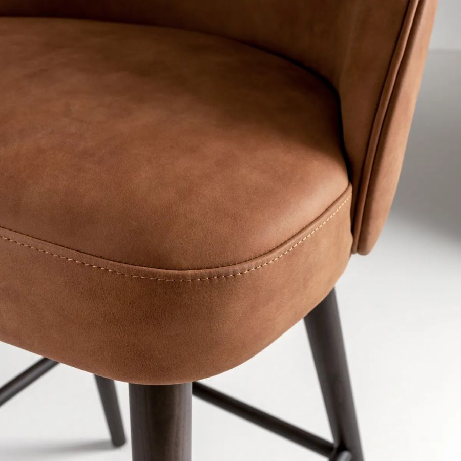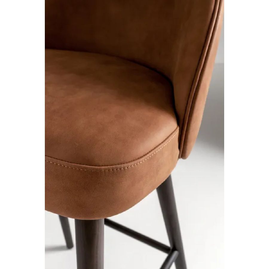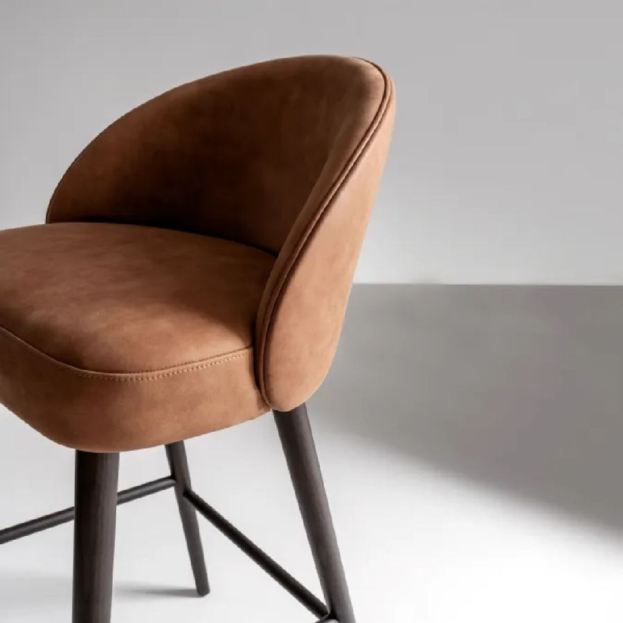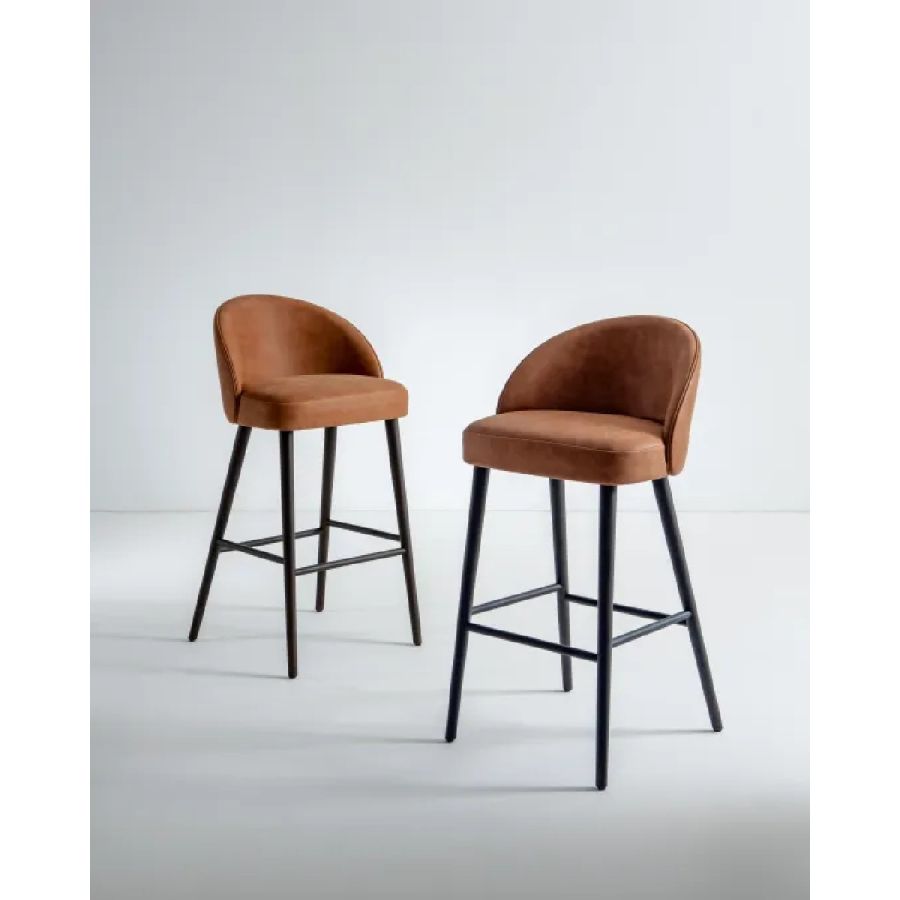 Padded high stool with legs in natural, stained or lacquered beech or ash wood, and covered in leather, velvet or fabric.