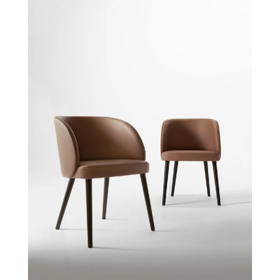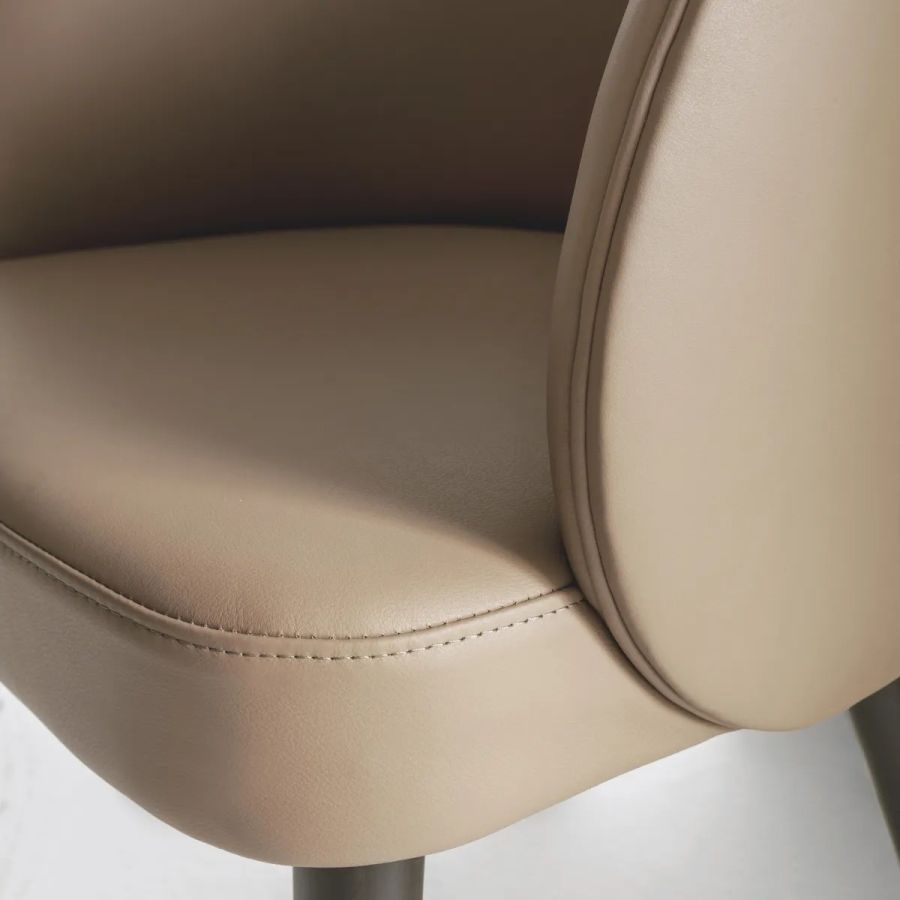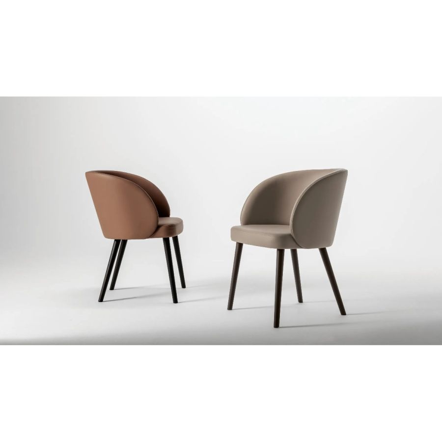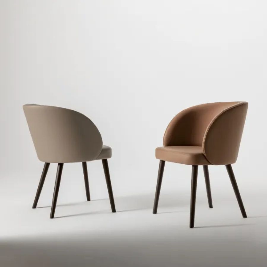 Padded chair with legs in natural, stained or lacquered beech or ash wood, and covered in leather, velvet or fabric.