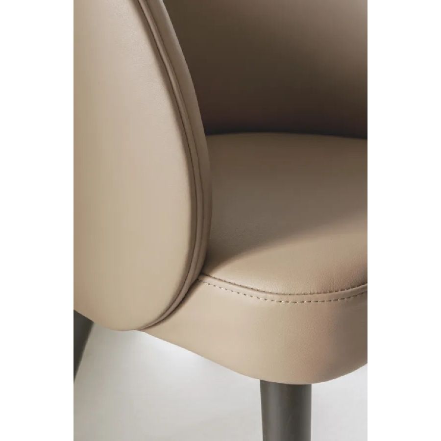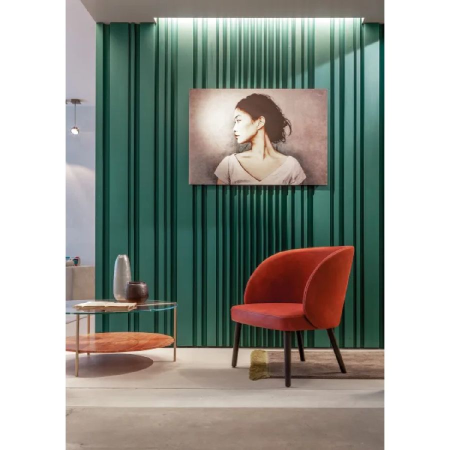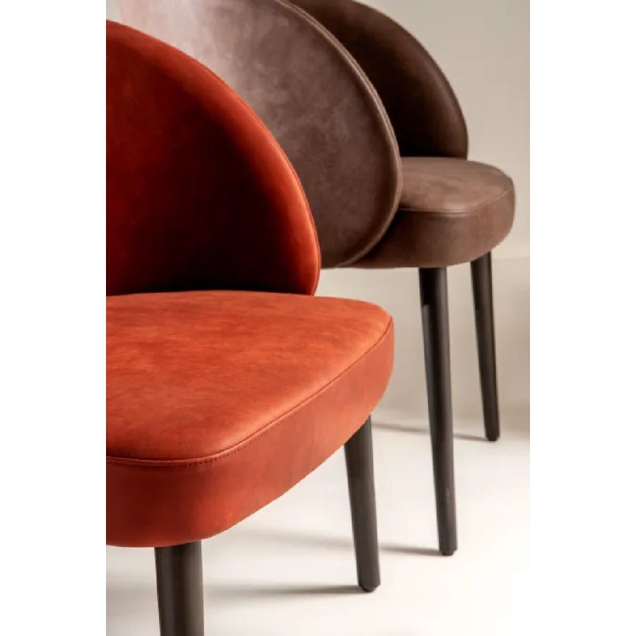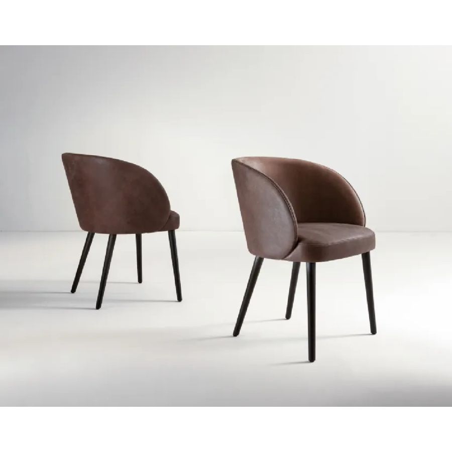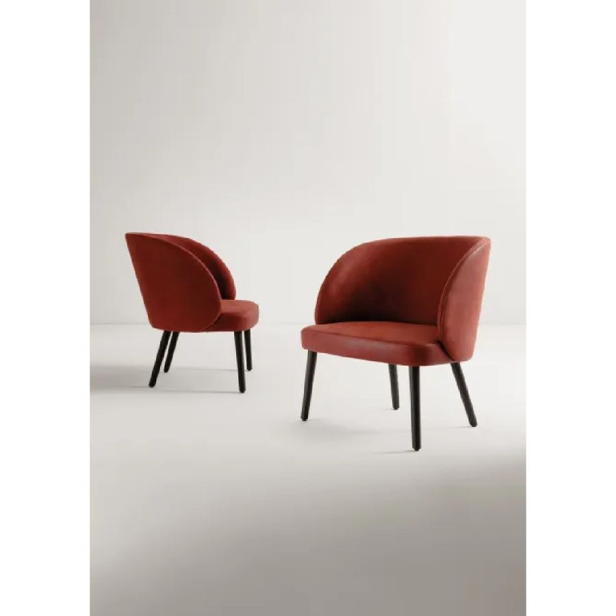 Padded chair with legs in natural, stained or lacquered beech or ash wood, and covered in leather, velvet or fabric.
