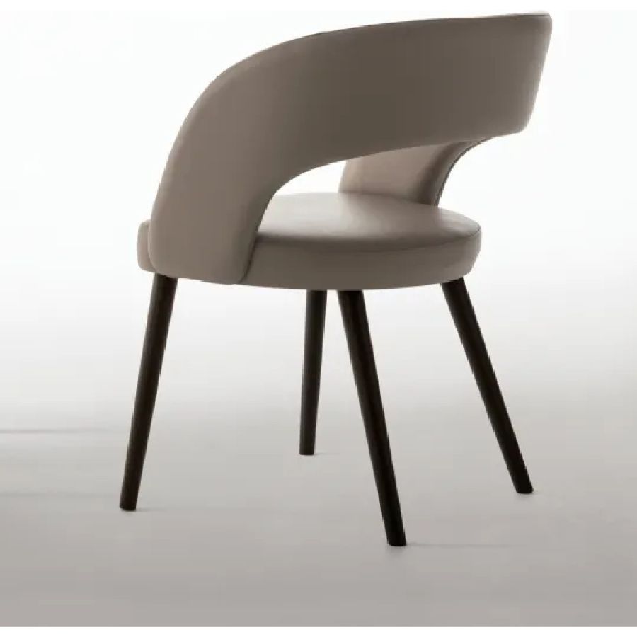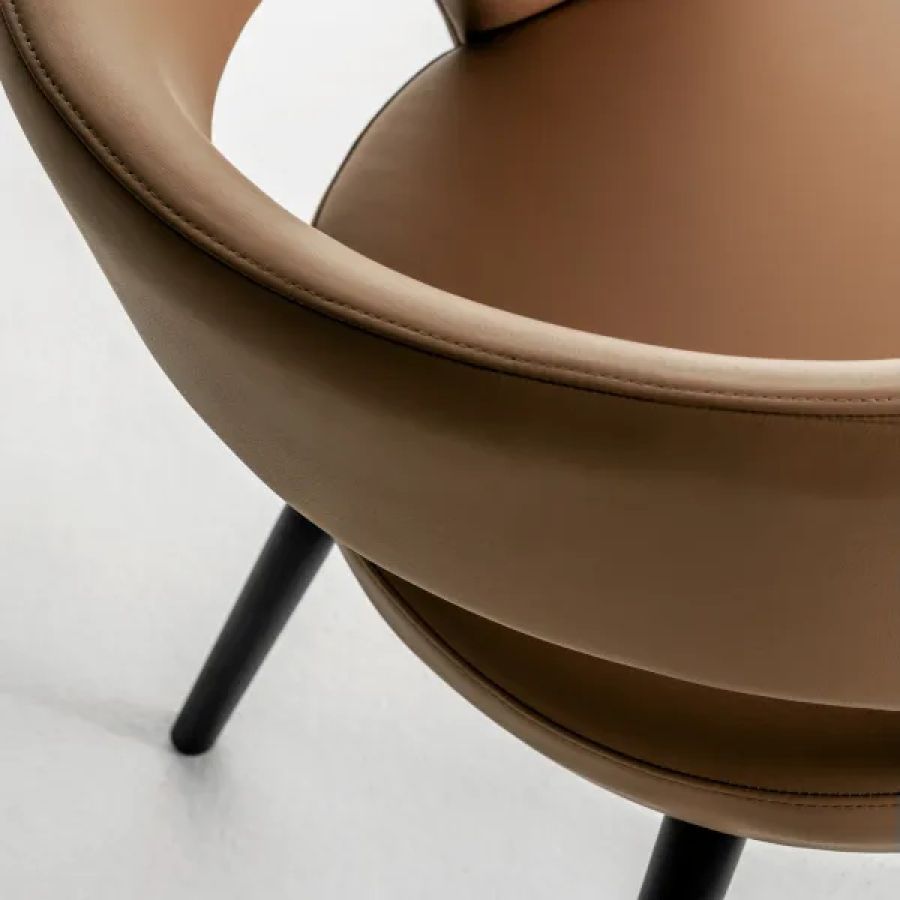 Padded chair with legs in natural, stained or lacquered ash wood, and covered in leather, velvet or fabric.
