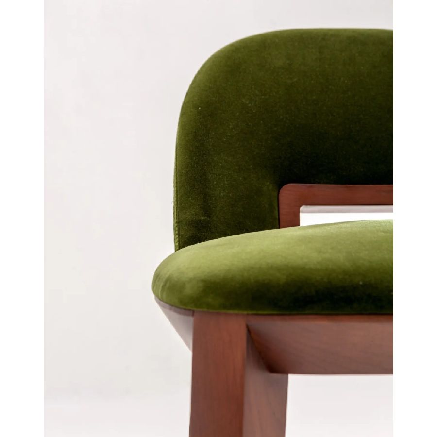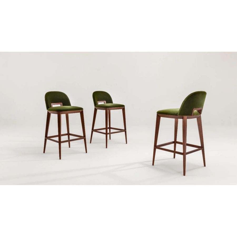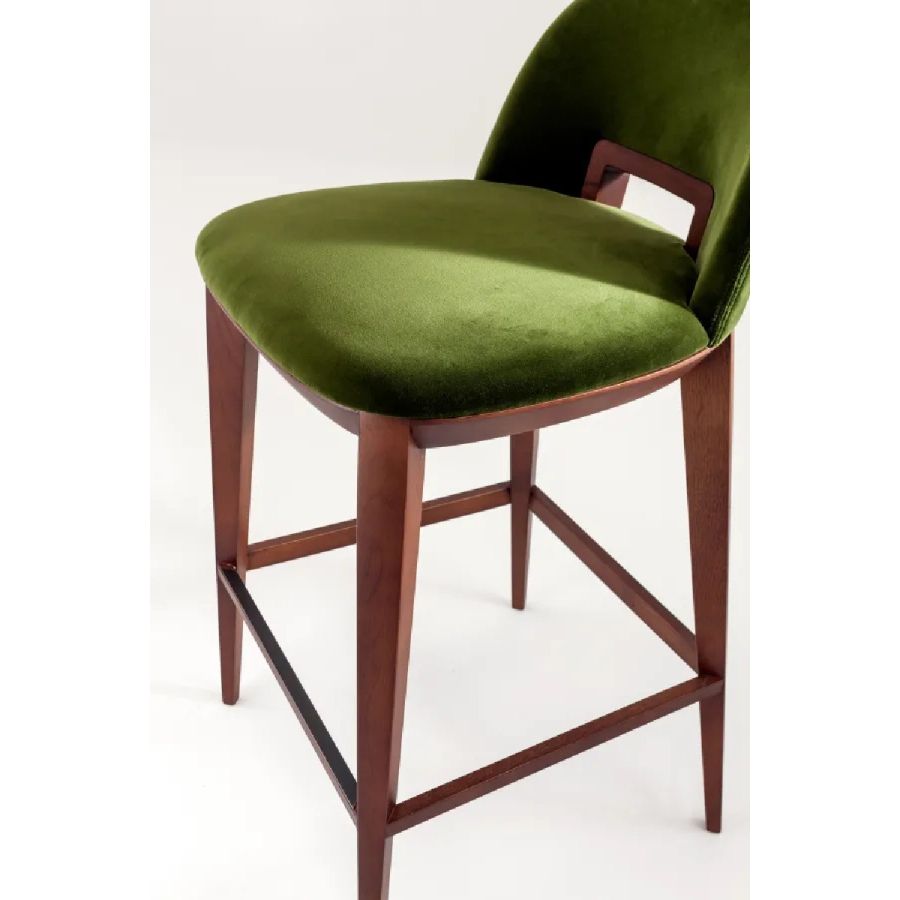 Padded high stool with wooden structure and seat in expanded polyurethane covered in leather, velvet or fabric.