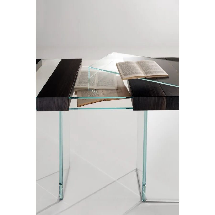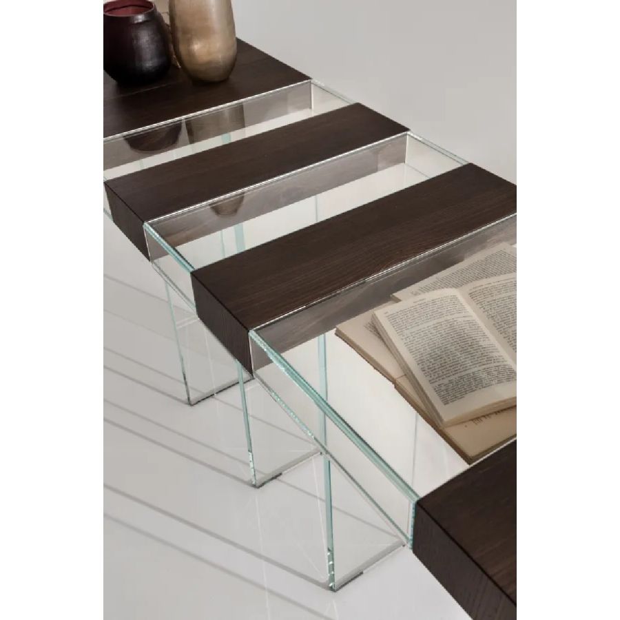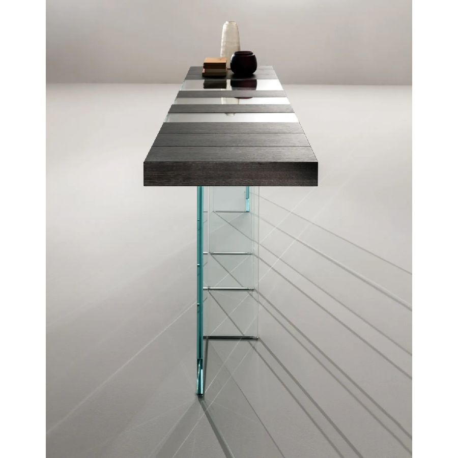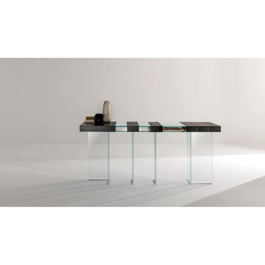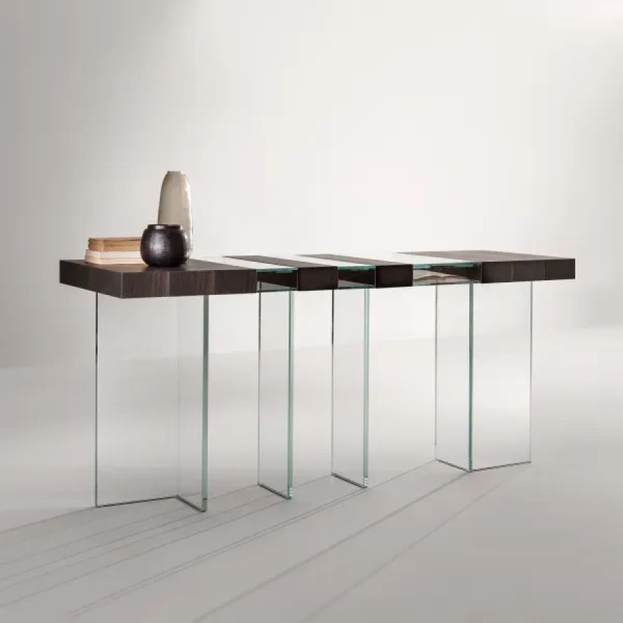 Console with modules in marble or wood and opening glass display cases, available in different lengths (multiples of 15 cm). Legs in extra-clear glass.
