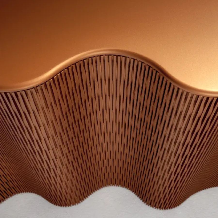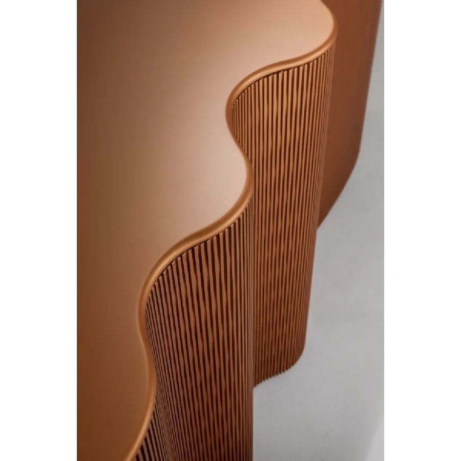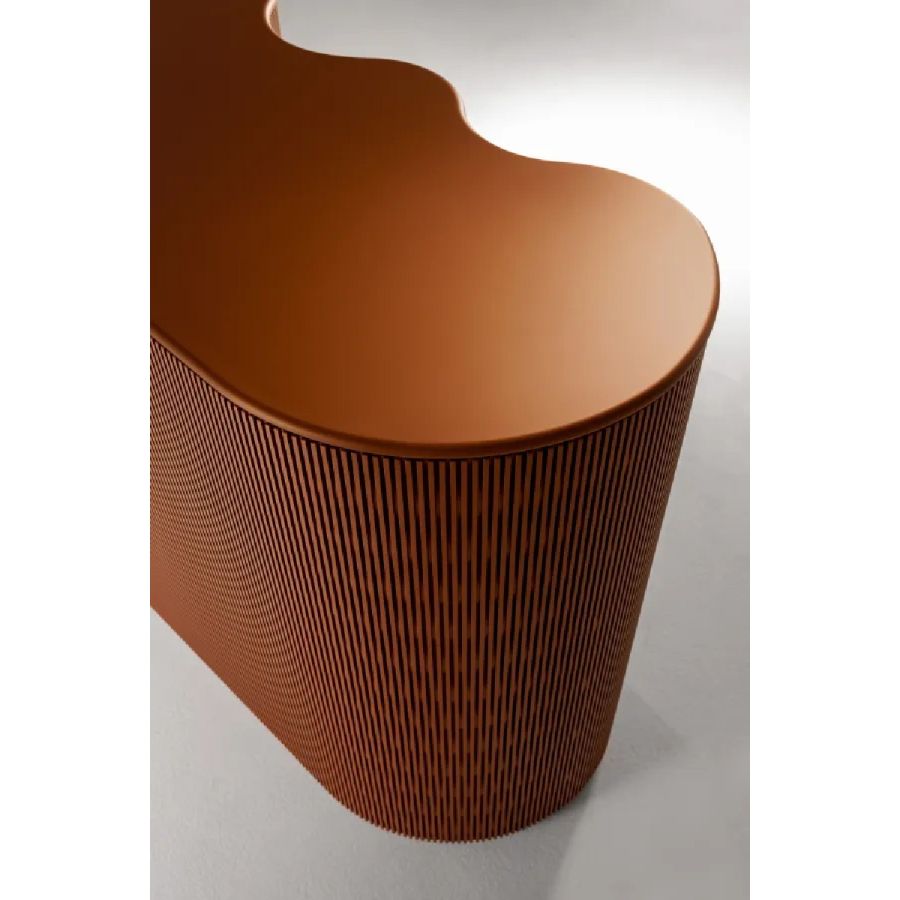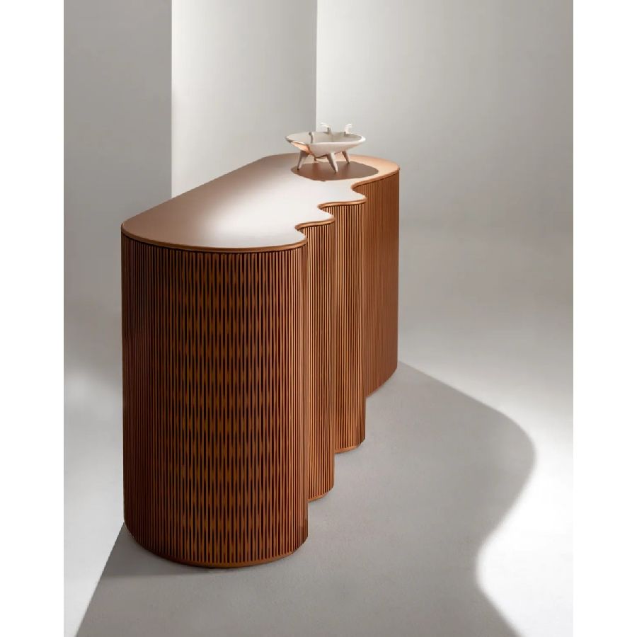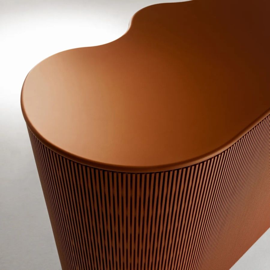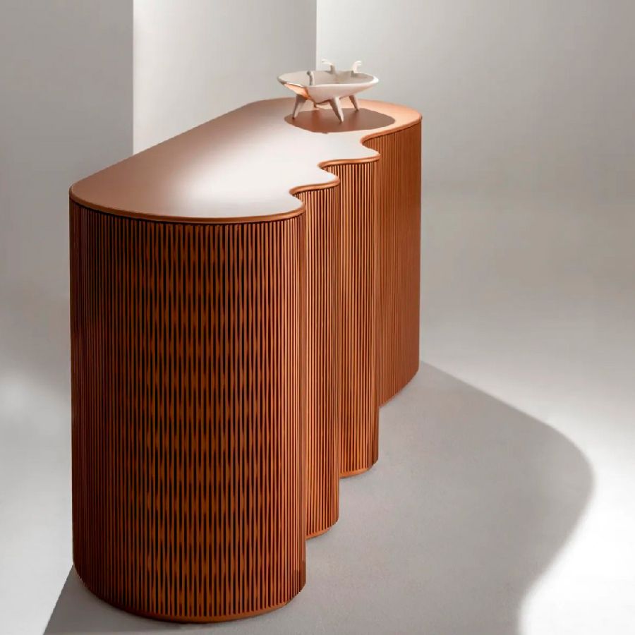 Console in Lacca 61 dyed wood, featuring a curved base with a honeycomb geometric design and a plain top.