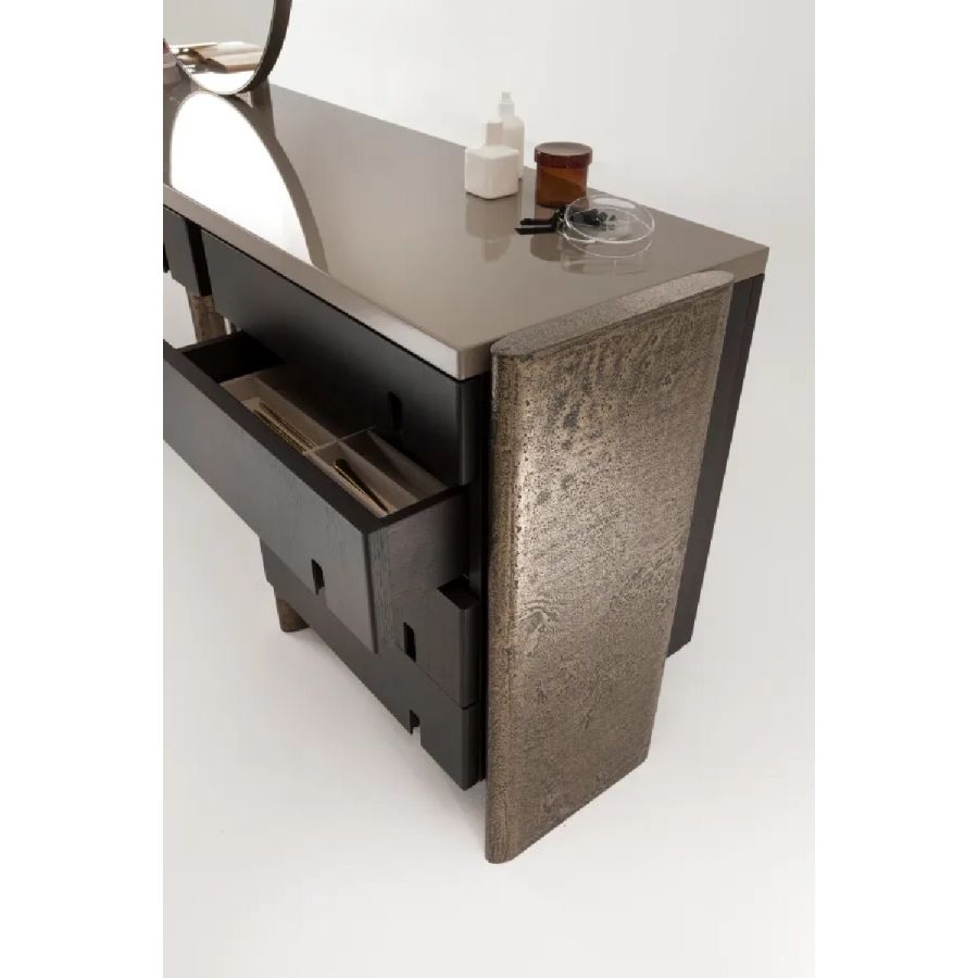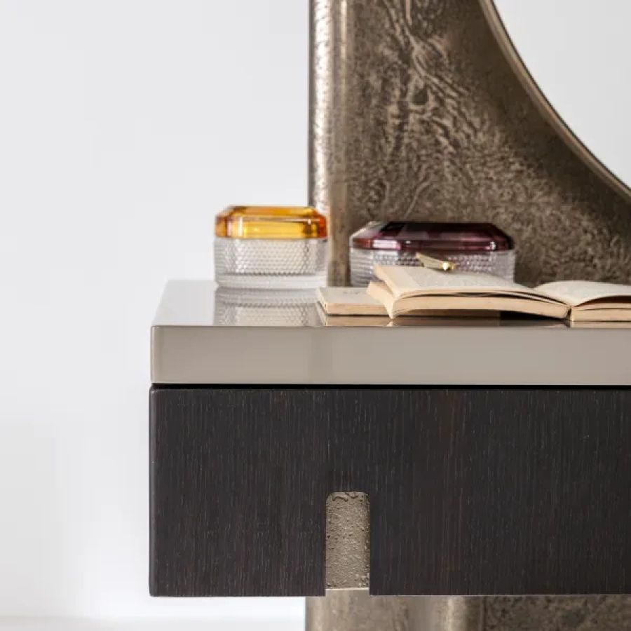 Top, chest of drawers and structure available in plain, dyed or lacquered wood in all RAL colours. Sides, panel and handles available in patinated 'gold' finish or in Raptor liquid metal.
