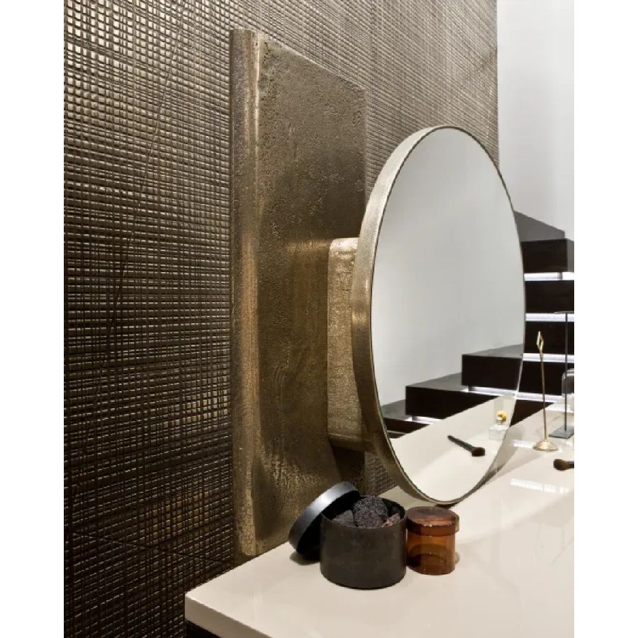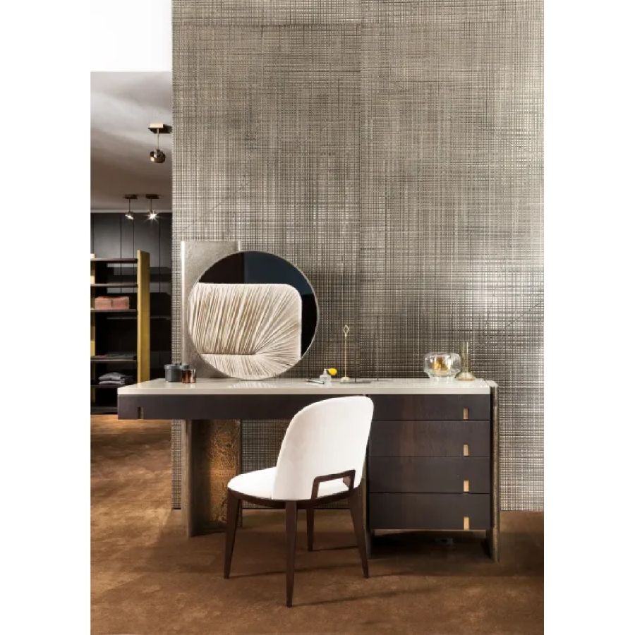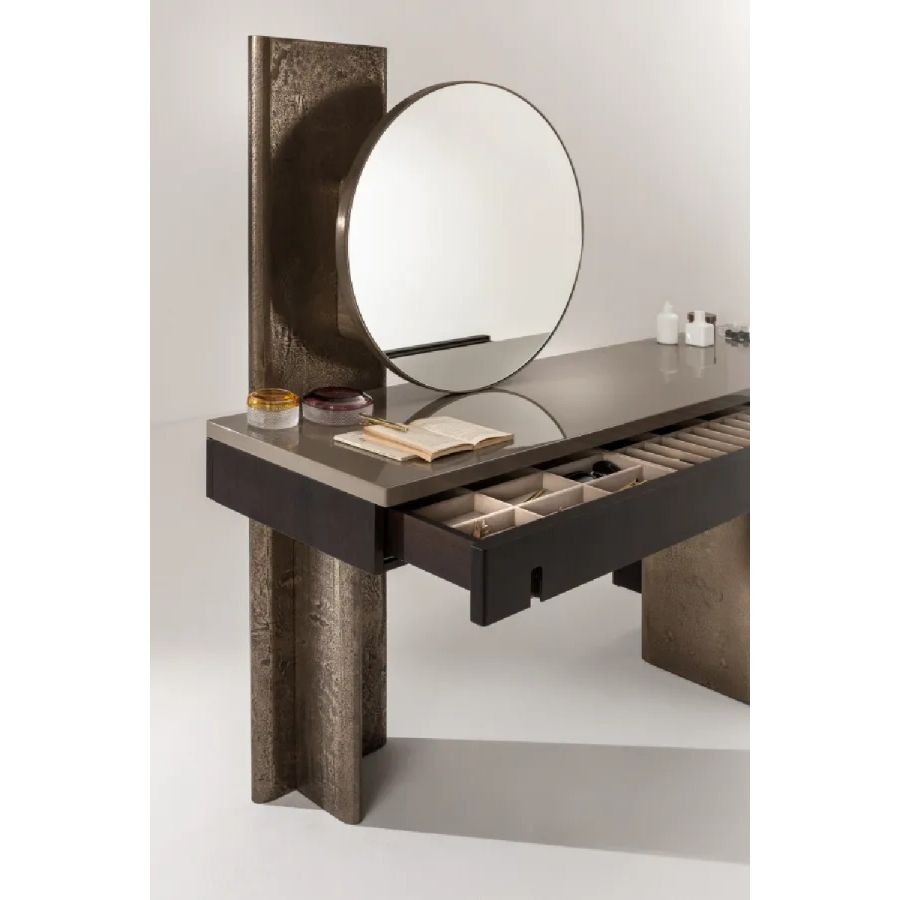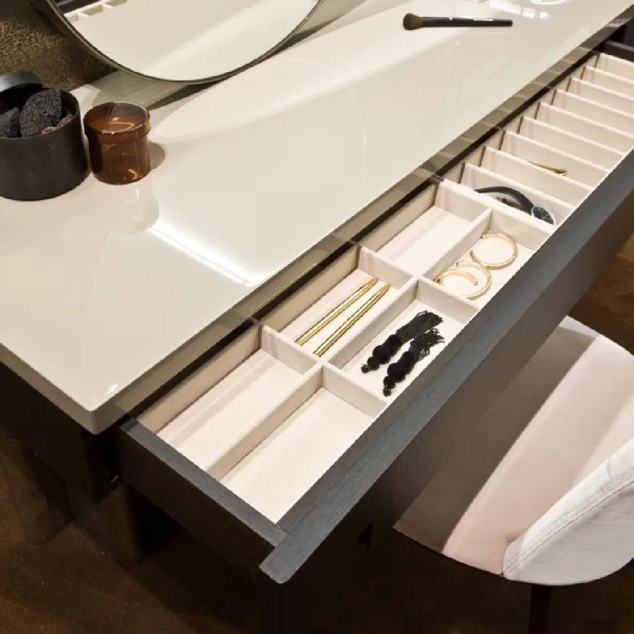 Vanity console with structure, chest of drawers, decorative panel and round mirror. Equipped on request with practical multi-purpose storage dividers.