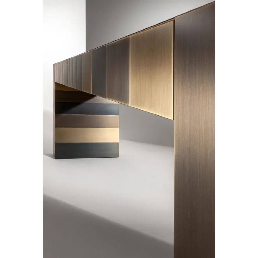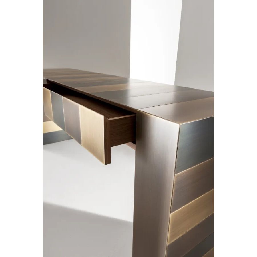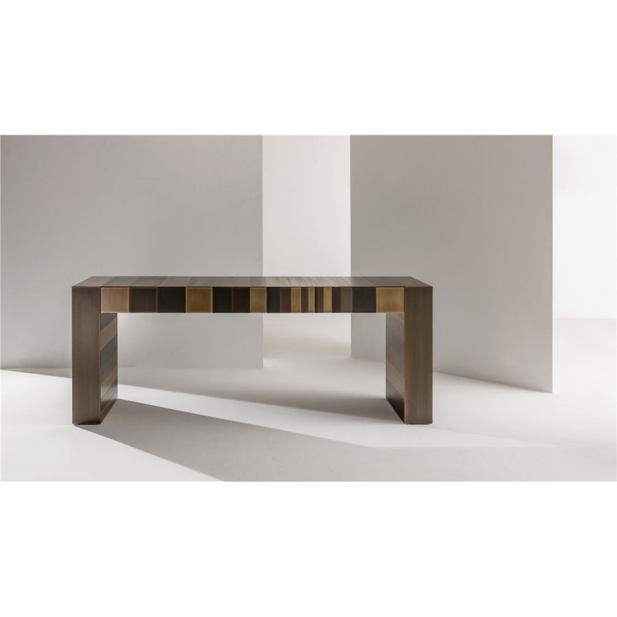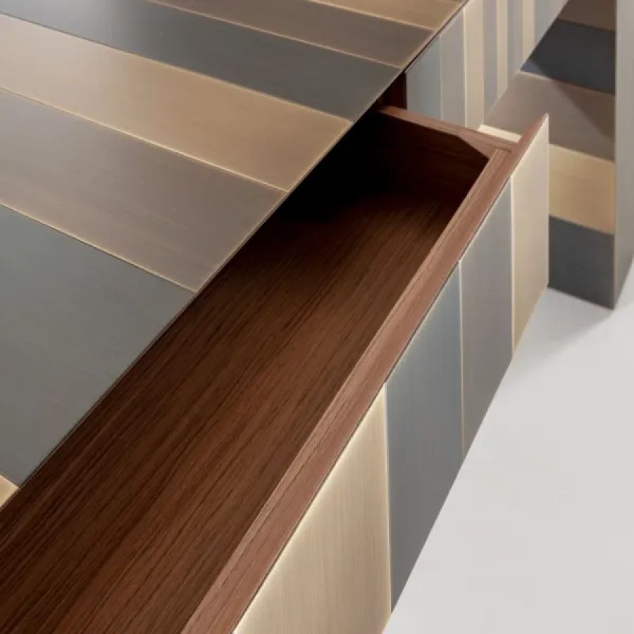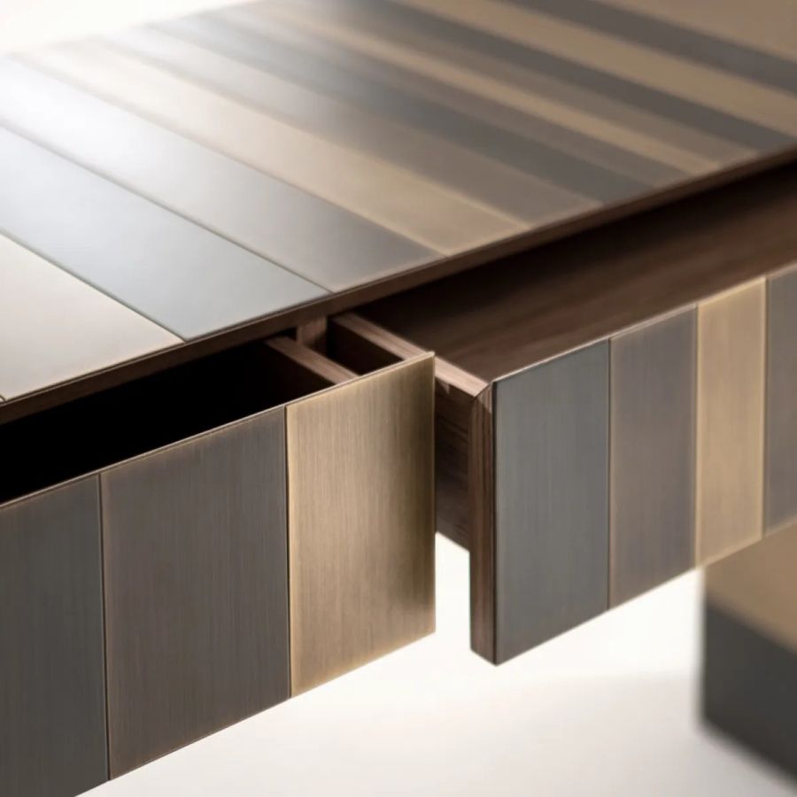 Desk entirely covered in a sequence of metal bands, equipped with two drawers.