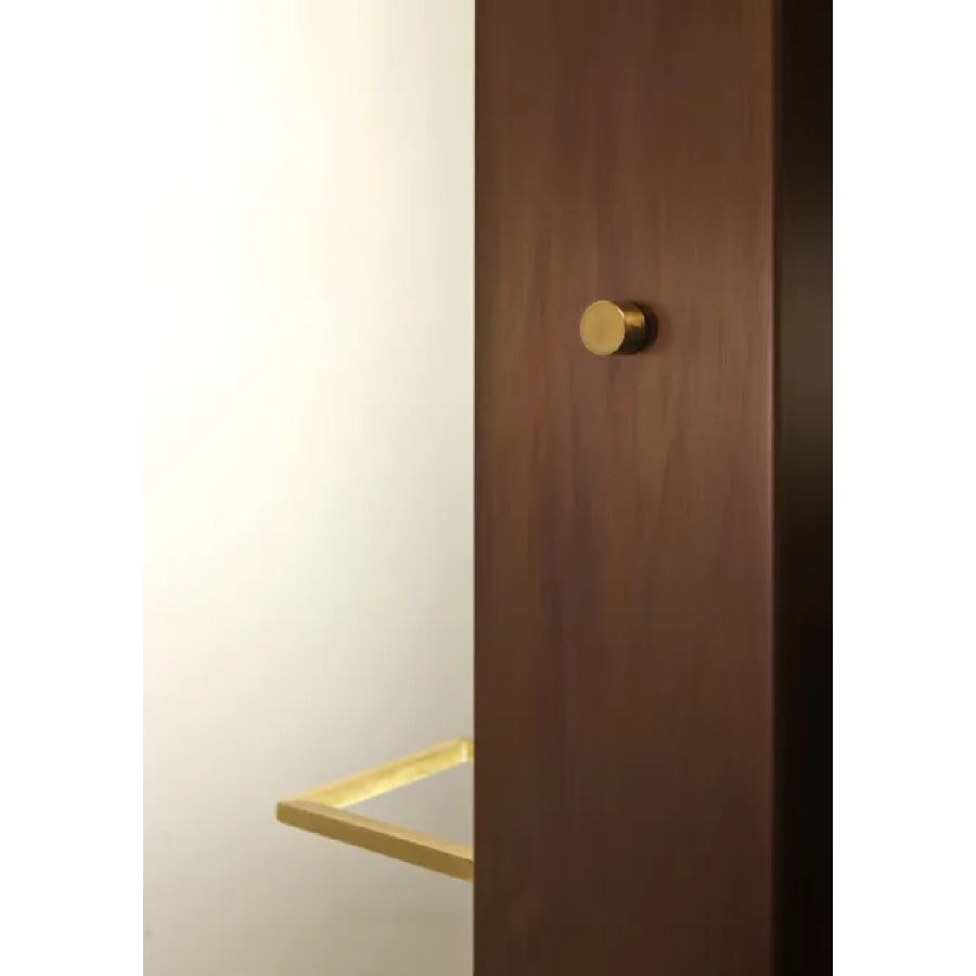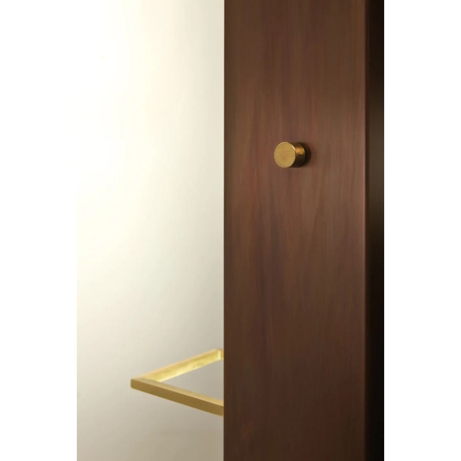 Floor lamp with burnished copper structure and decorative elements in satin brass.