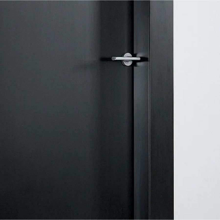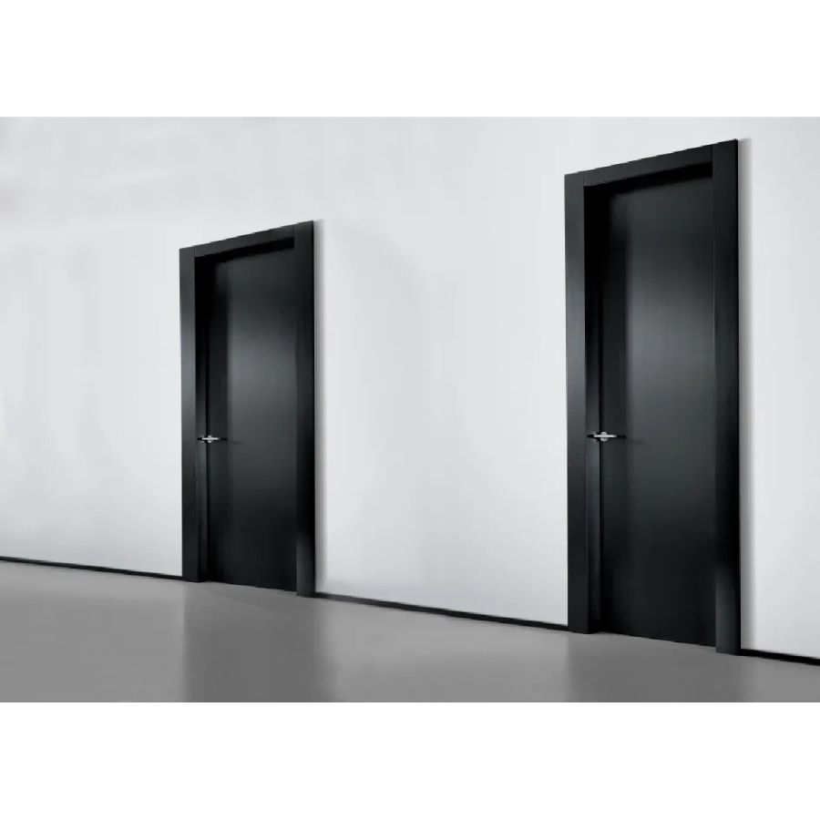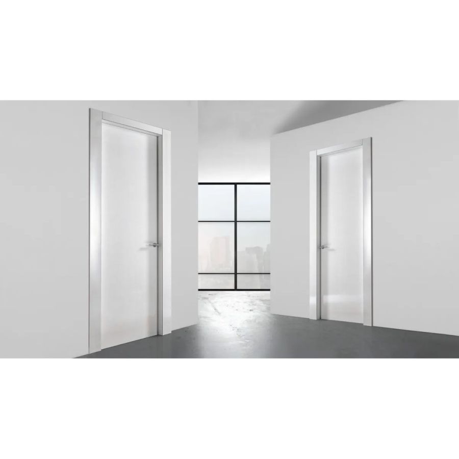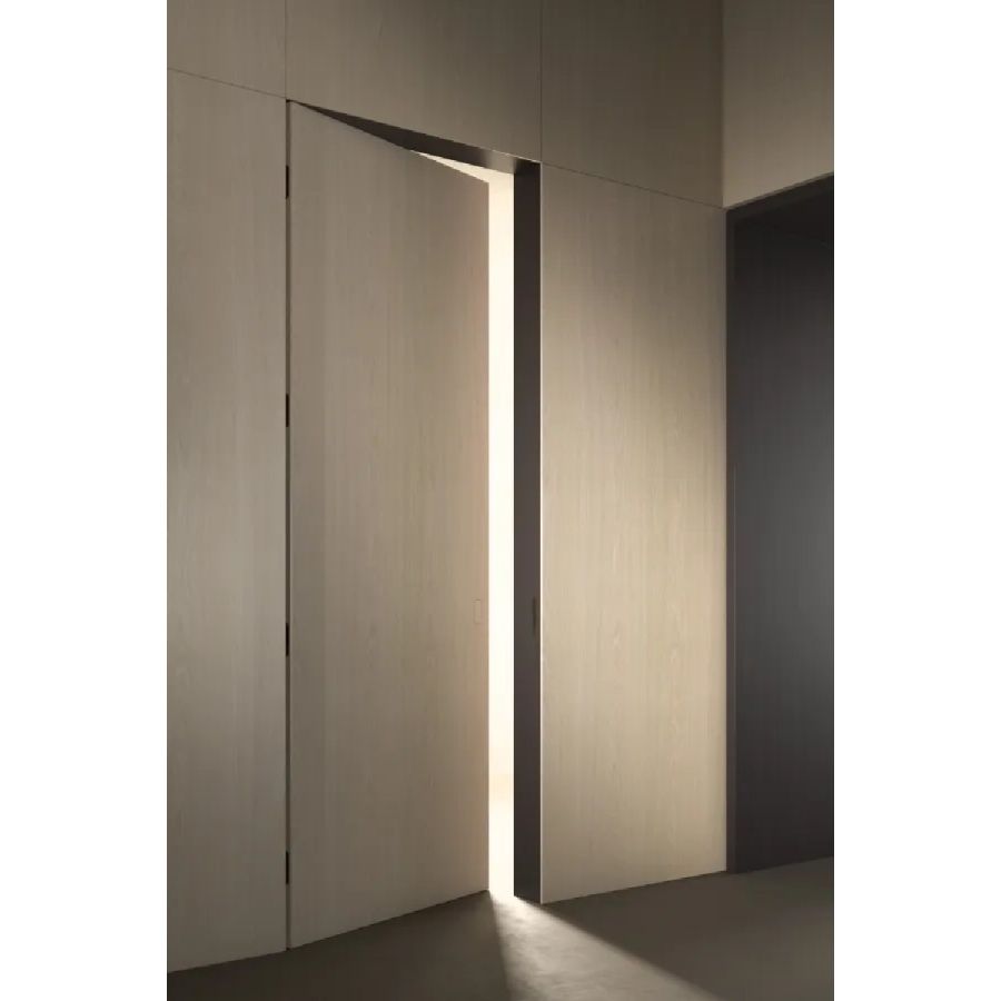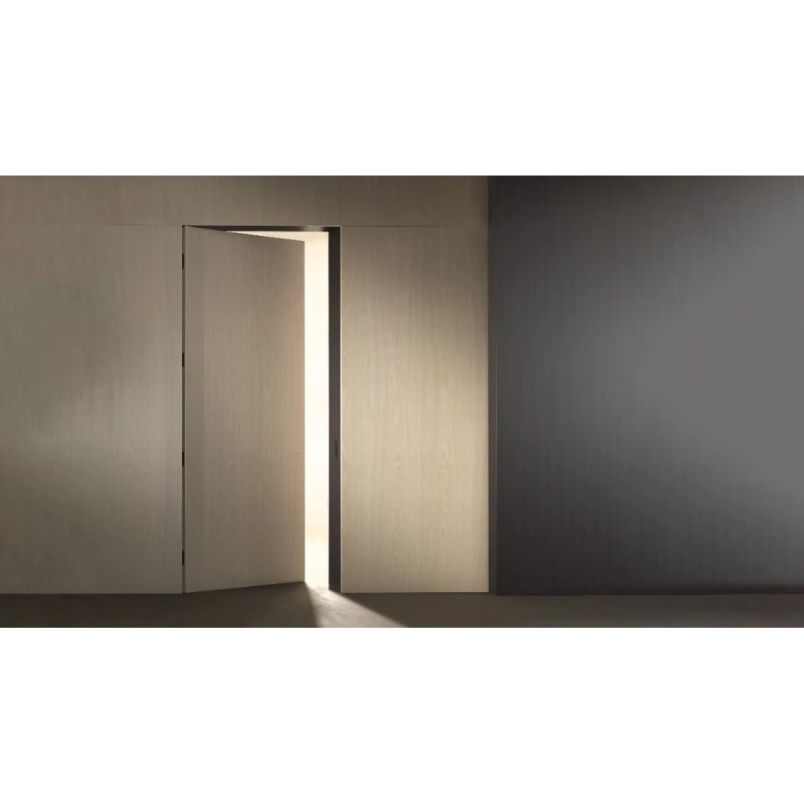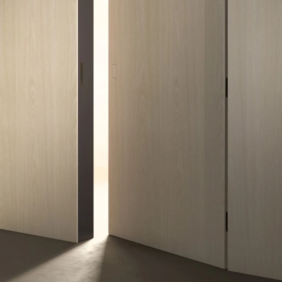 Available in custom sizes, with 'Slim' jamb, featuring a central glass panel, and integrated into boiserie systems. Available in all the essences of the collection, in lacquered and aniline-dyed wood in all RAL/NCS colours, and in fabric.