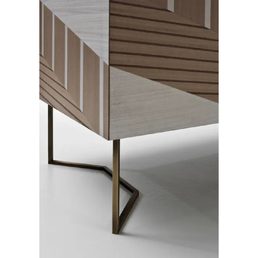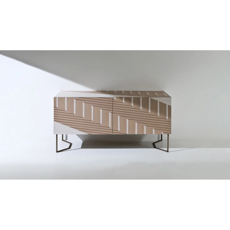 Handcrafted sideboard with burnished brass legs, inlaid doors and structure. Equipped with push-pull doors, an internal shelf and two drawers.