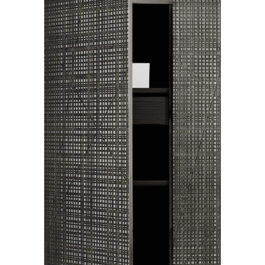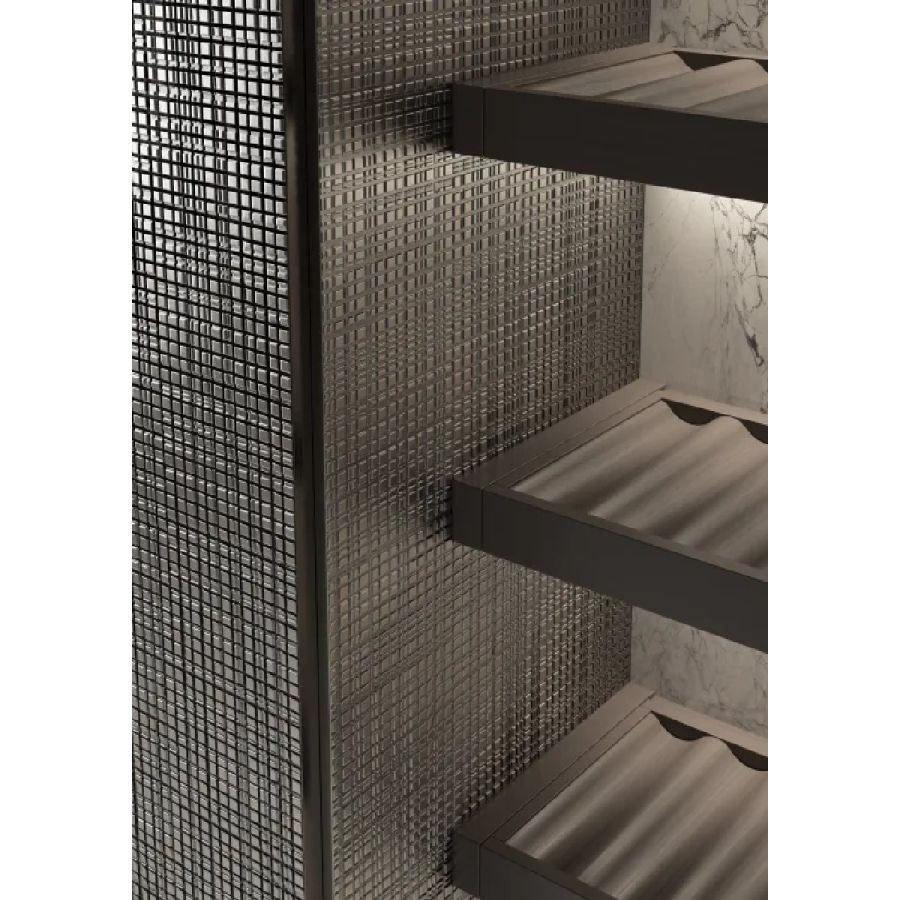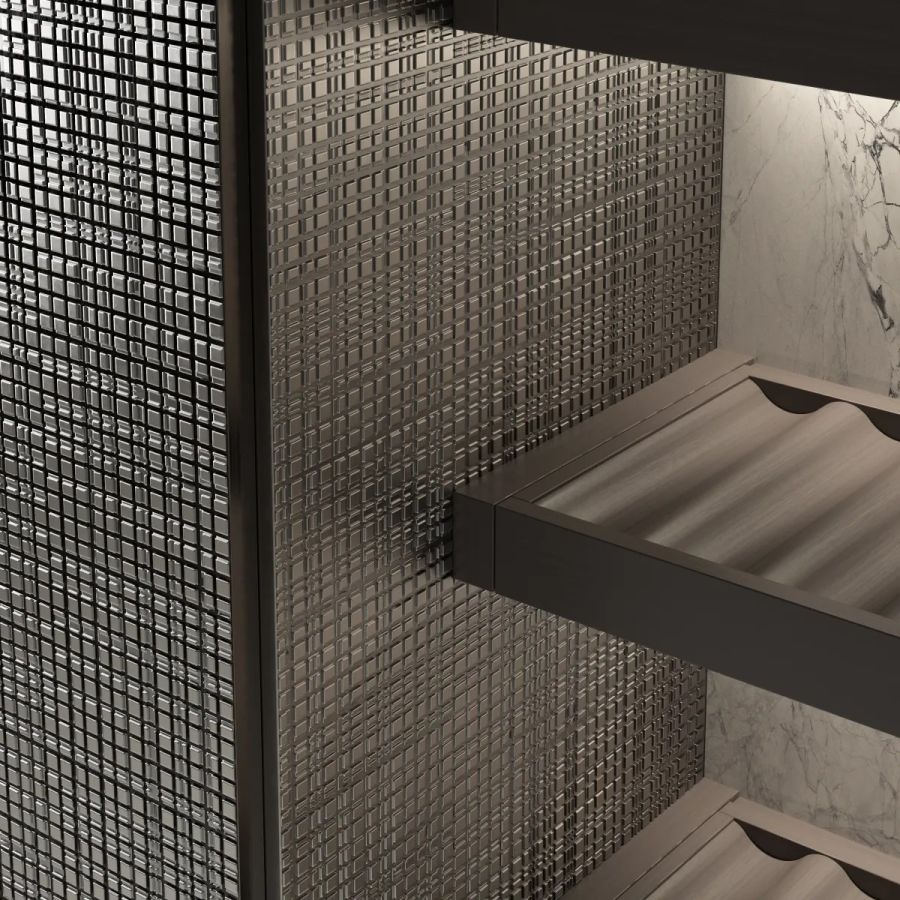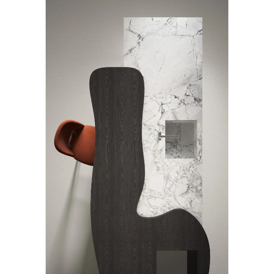 The capacity to re-create drawing inspiration from the wooden platforms used by the marble workers, which bear the apparently casual marks of discs used for cutting the marble, created the top in engraved solid wood slabs, characterized by a texture that is unique and always different. The textures are random and of different depths.