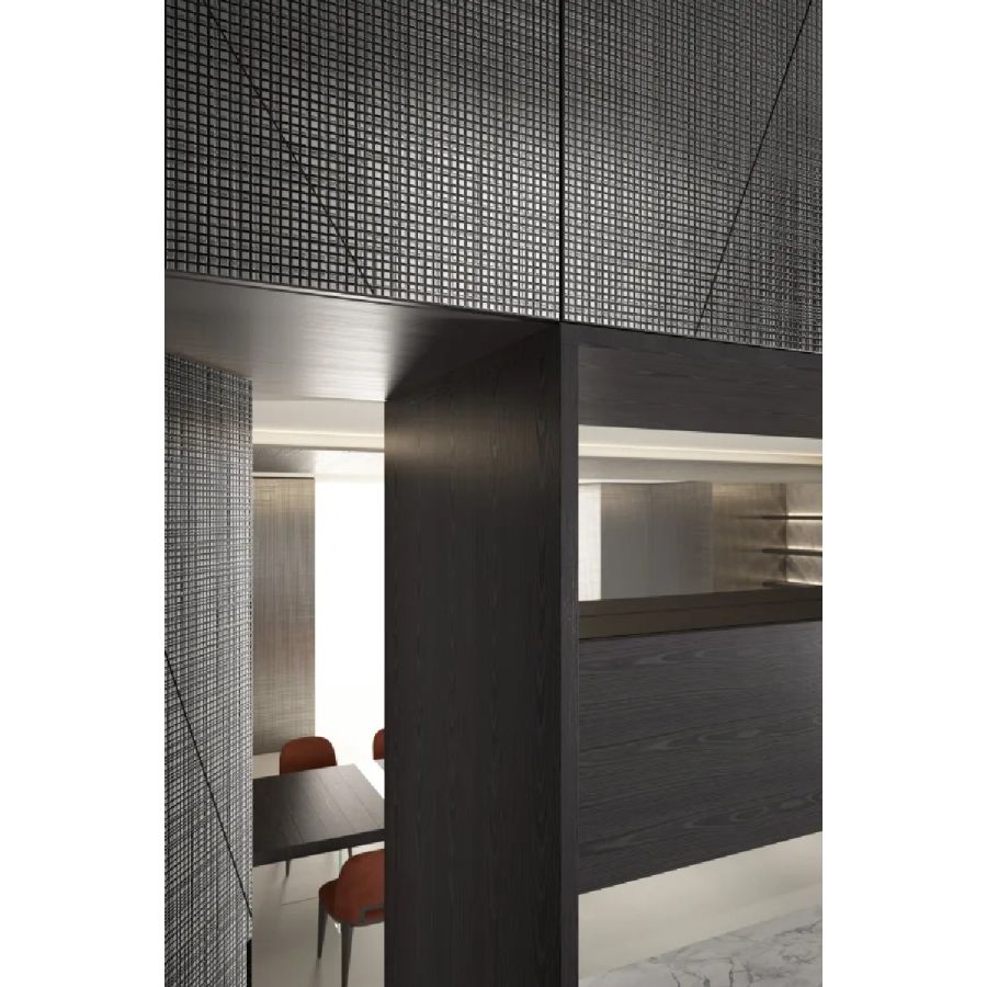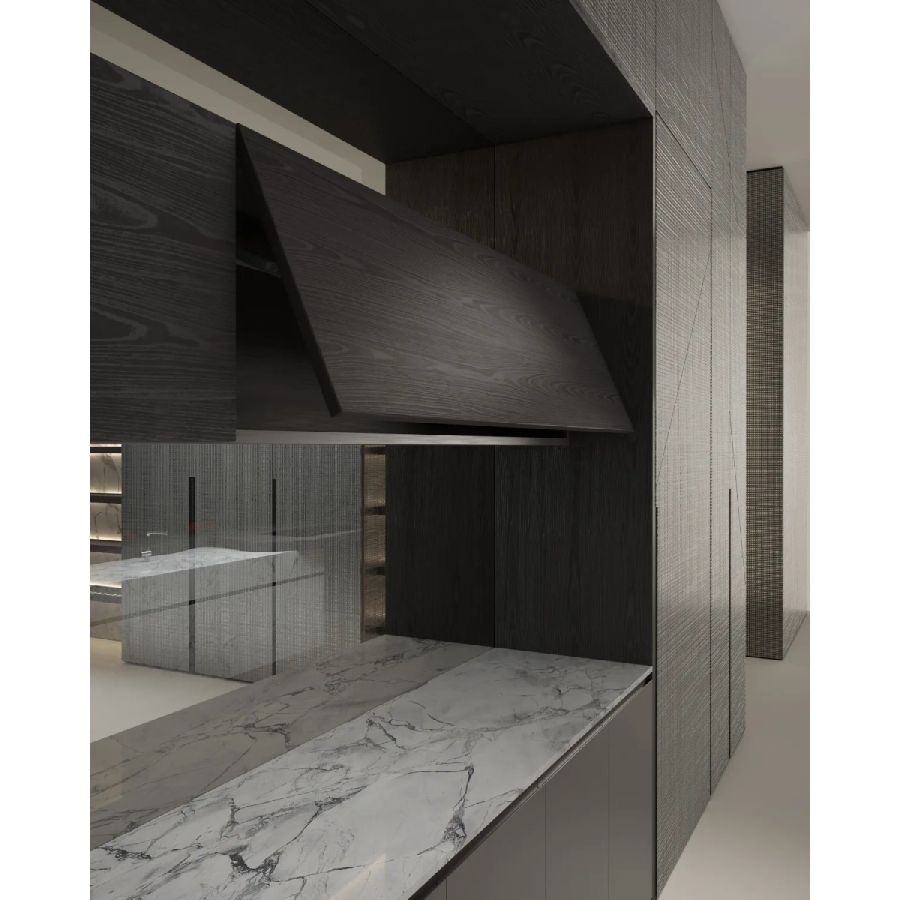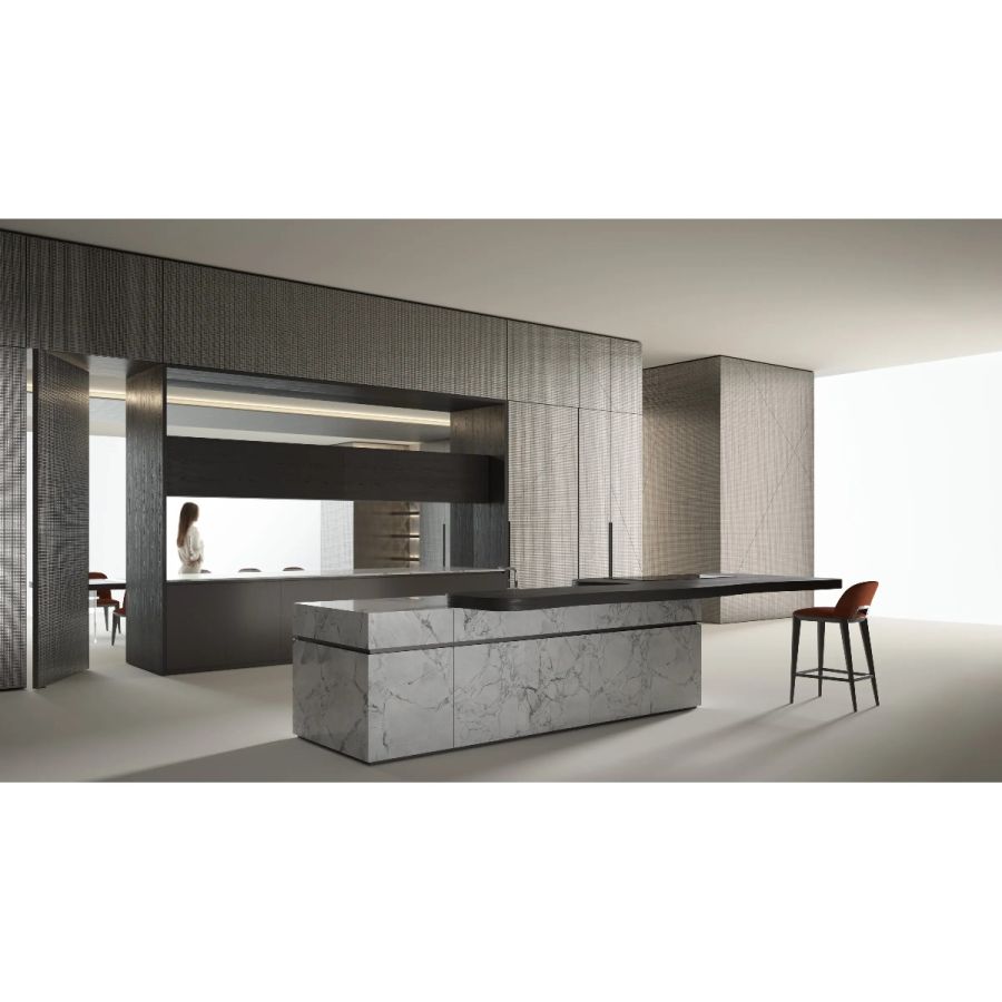 Bespoke kitchen project. Island with integrated Snack Bar, partition base and wall unit system, columns integrated into the boiserie, Maxima ceiling and doors.