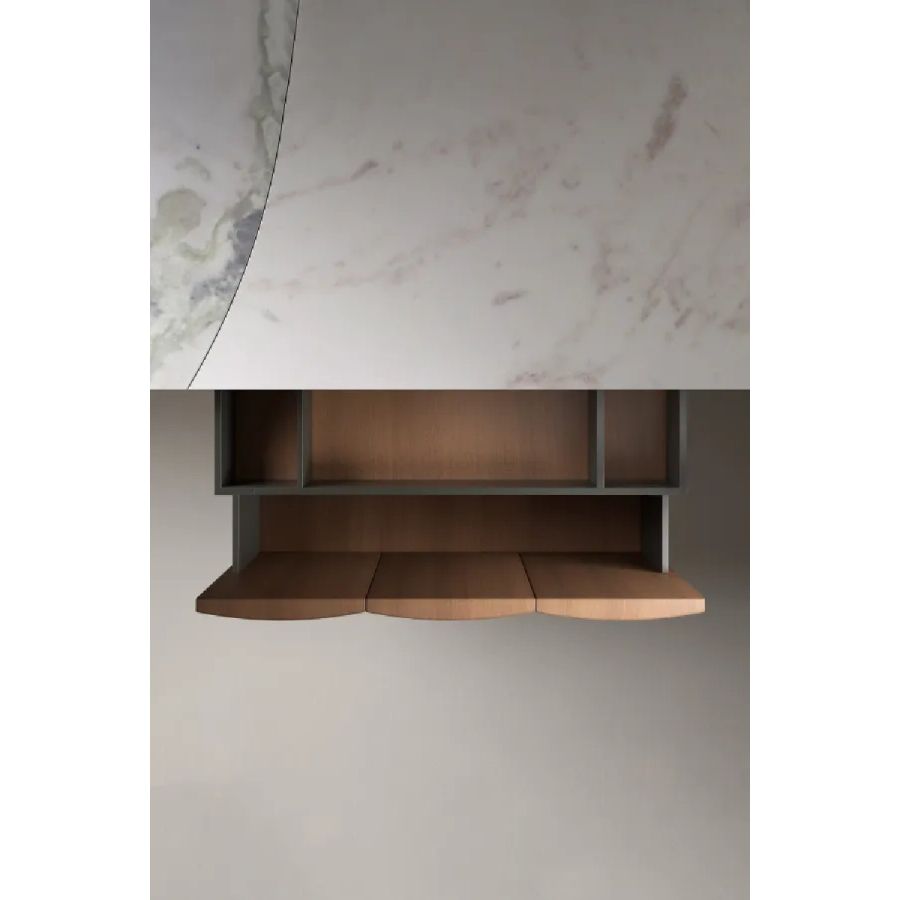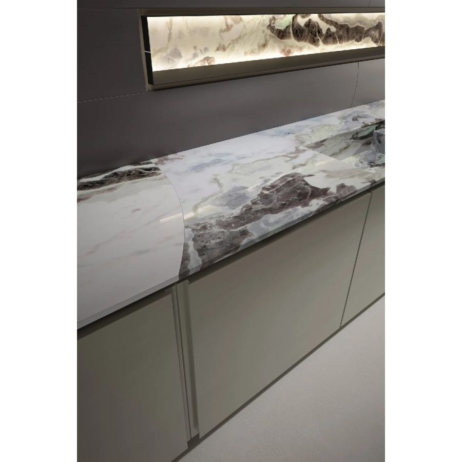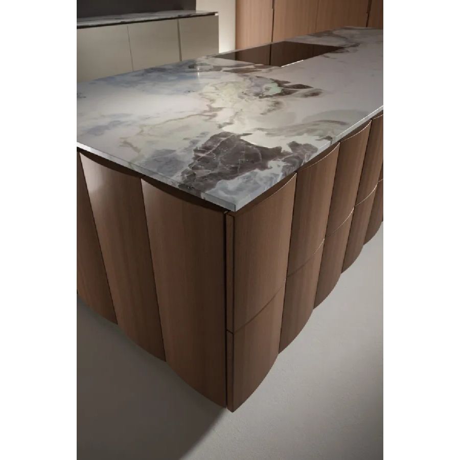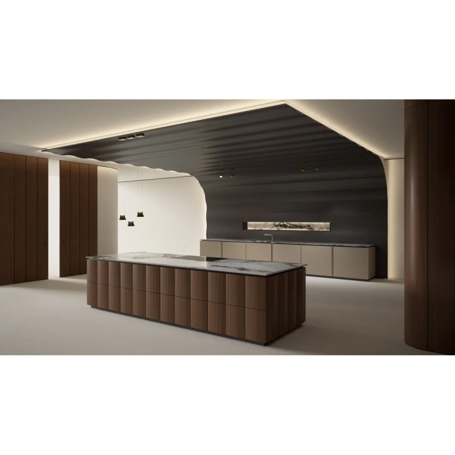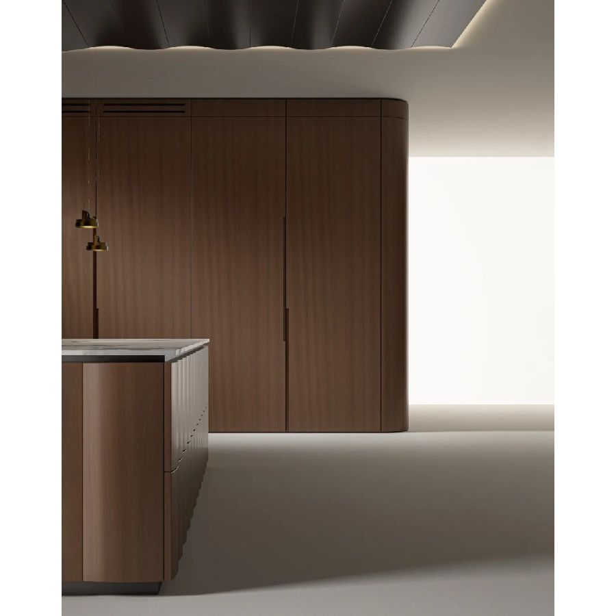 Bespoke kitchen project. Equipped island and columns, base units integrated with the Dune boiserie and ceiling. Sliding doors Dune.