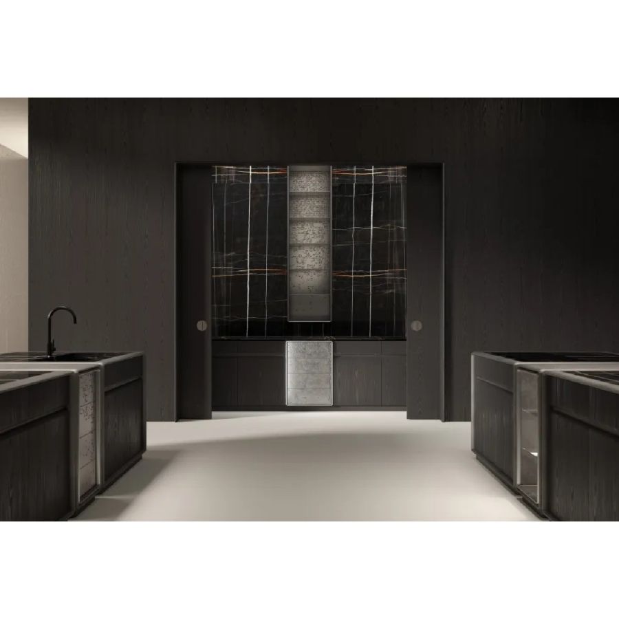 Bespoke kitchen project. Two modular islands, columns with recessed niche. Concealed 'Pantry Kitchen'. Boiserie and integrated Talento doors.