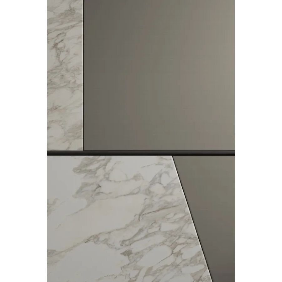 The Terre design evokes a geometric aerial view. Rounded slabs in wood, marble or leather constitute extremely versatile custom-made modules separated by wooden profiles with a rounded section.